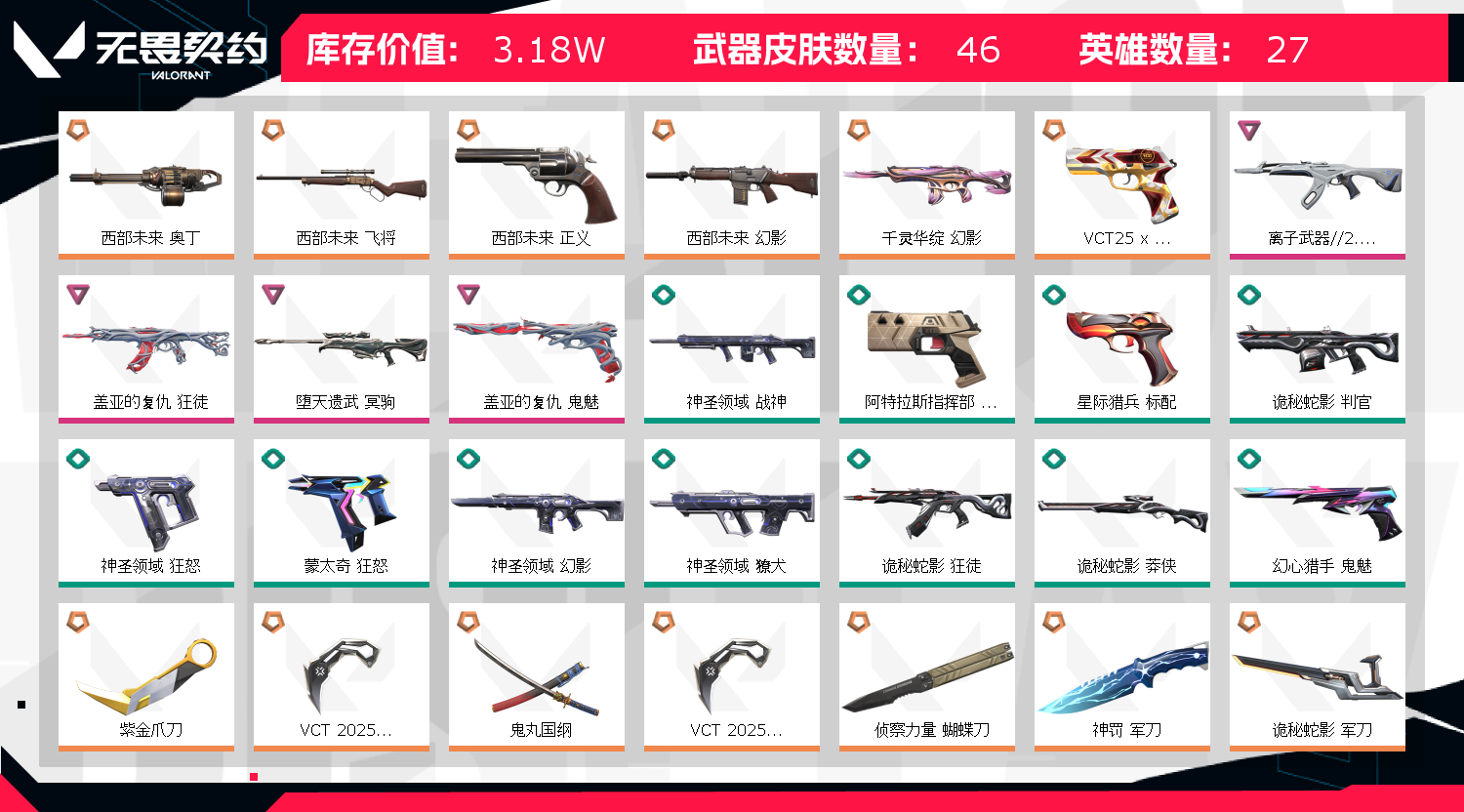 使用外挂,恶意发言,在游戏内骗人等违规操作,拉黑全网公示,使用外挂脚本导致非正常游戏封号的,在平台提取租客实名iP地址,本账号经过江西省南昌市公安局青山湖分局网络财产备案,一经发现直接报警处理立案追责,根据账号价值全额赔偿,感谢支持!!;西部未来 奥丁,紫金爪刀,VCT 2025 爪刀,盖亚的复仇 狂徒,离子武器//2.0 狂徒,堕天遗武 冥驹,西部未来 飞将,