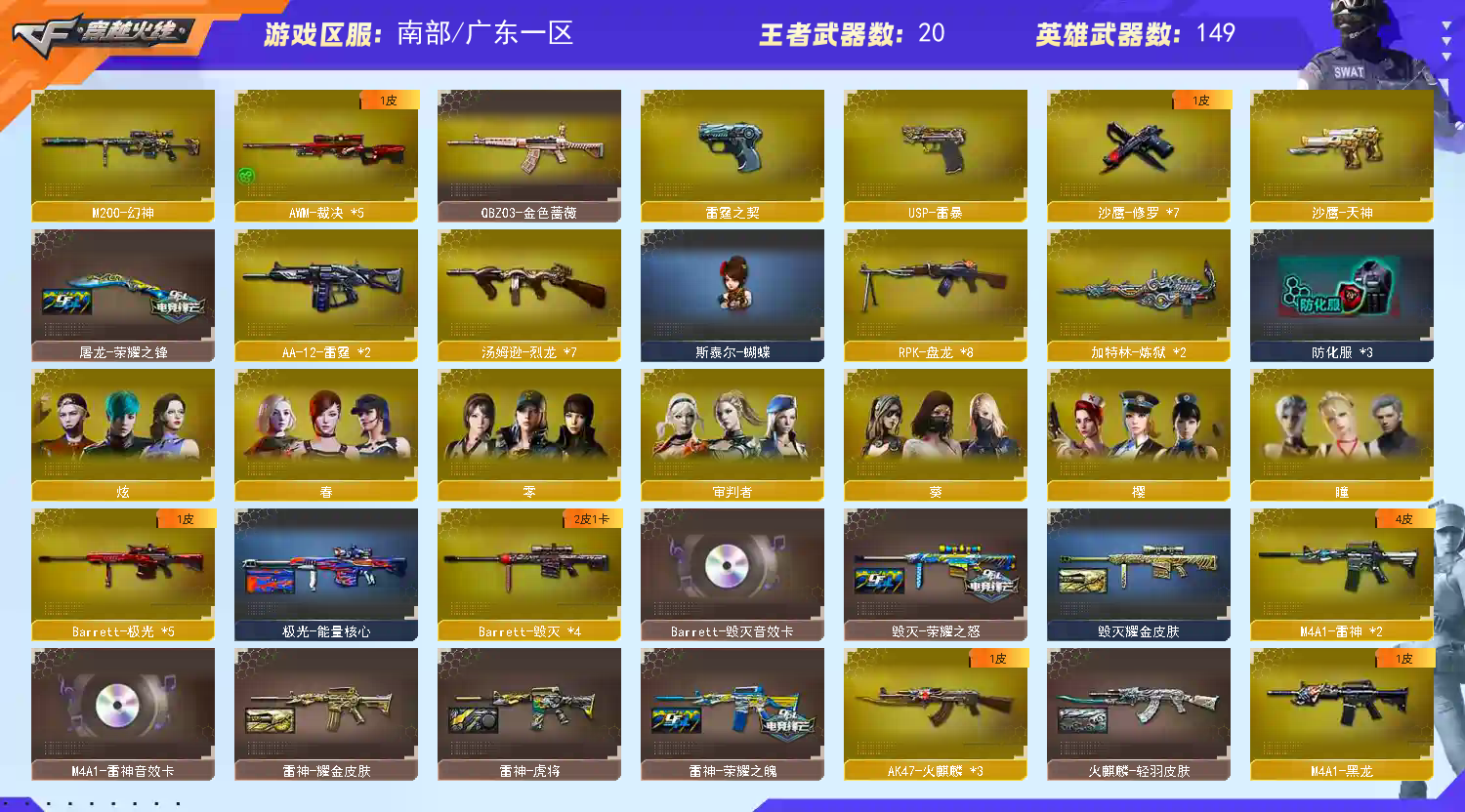南部战区合区大区(江西一区、南方大区、湖南一区、湖南二区、湖北一区、湖北二区、广东一区、广西一区、广东二区、广东三区、广东四区)登录的时候选择广东一区。;USP-雷暴,RPK-盘龙,QBZ03-金色蔷薇,M200-幻神,