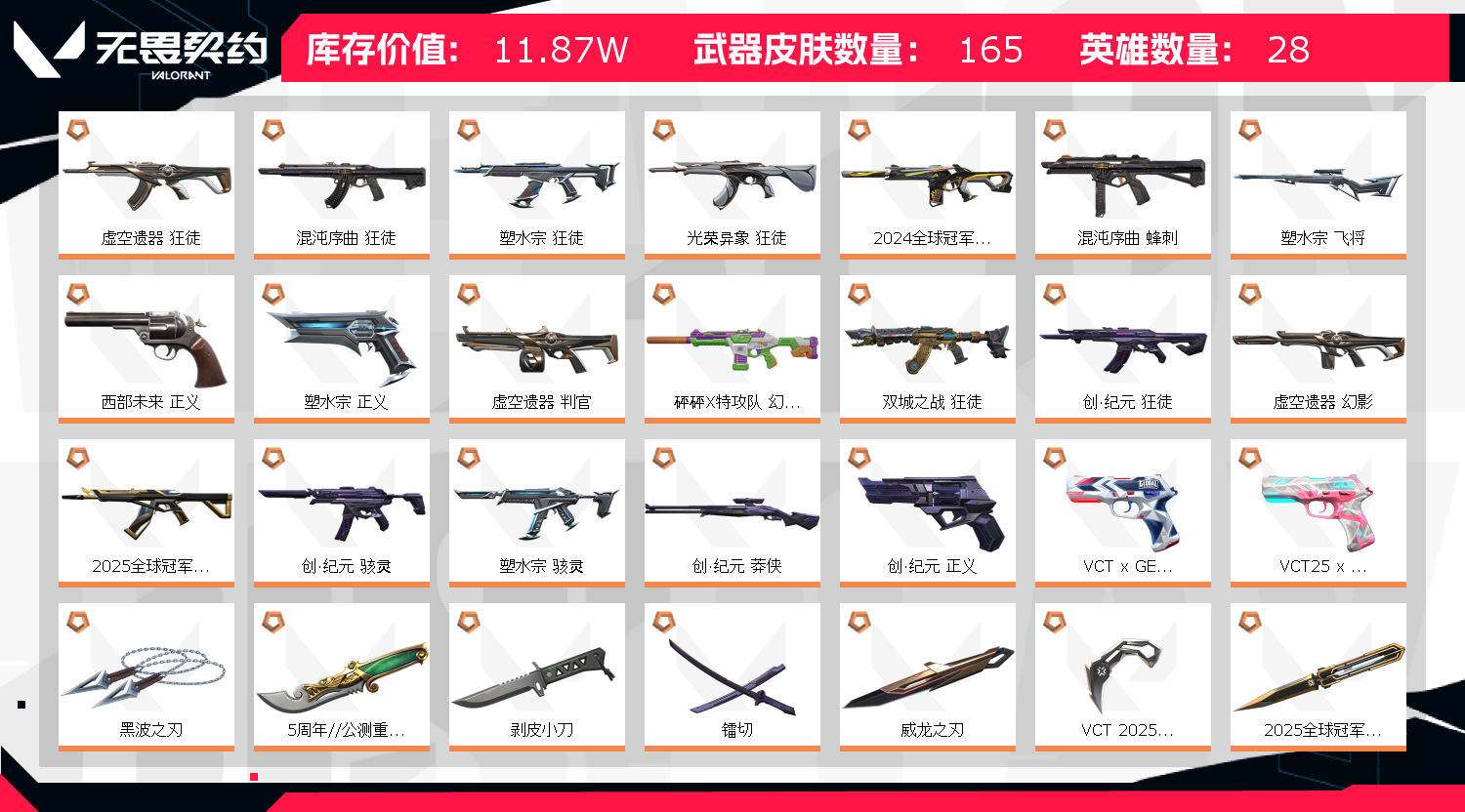 11万库 25冠军套ak蝴,光荣异象AK,VCT25爪刀,塑水宗AK,太刀镭切,虚无AK,五周年小刀