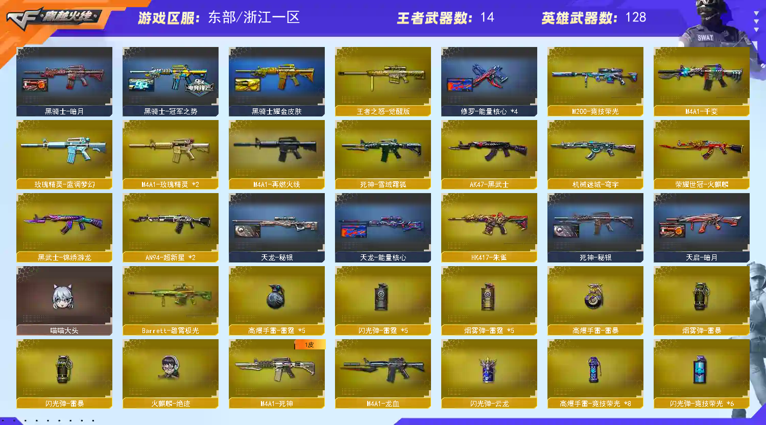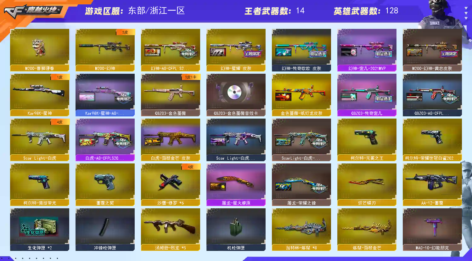 149V幻神五皮(欧欧/S24冠军/宠儿/星耀/黄忠)QBZ三件套!星神带皮白虎带3皮6烈龙7炼狱 【浙江一区-浙江】 140V23王者1炫金VIP6【主武器类型】 M200-幻神 M200-竞技荣光 Kar98K-星神 荣耀世冠-火麒麟 Scar-白虎 HK417-朱雀 王者之怒觉醒版 Barrett-毁灭 *2 Barrett-极光 *6 王者之力觉醒版 王者之魄觉醒版 M4A1-雷神 *3 QBZ03-金色蔷薇 王者之武觉醒版 M4A1-黑龙 *2 M4A1-黑骑士 *3 M4A1-千变 M4A1-死神 M4A1-龙血 M4A1-武圣 王者之心觉醒版 AK47-火麒麟 *2 AK47-无影 无影神兵利器 AK47-黑武士 *2 黑武士-锦绣游龙 AK47-黑鲨 *2 AN94-超新星 *2 超新星-热带奇洋 烈龙悦心觉醒版 汤姆逊-烈龙 *5 加特林-炼狱 *8 AA-12-雷霆 AWM-天龙 *2 炫金骑士 火麒麟绝迹 C.A.T AK身先士卒 AKB-战士 AKB-战神 AK猩红传说 *2 M4A1-玫瑰精灵 *2 死亡之眼 黄金AK 烟雾弹-荣耀世冠白鲨2023 闪光弹-云龙 高爆手雷竞技荣光 *8 闪光弹竞技荣光 *6 烟雾弹竞技荣光 *8 高爆手雷雷霆 *5 闪光弹雷霆 *5 烟雾弹雷霆 *5 高爆手雷雷暴 闪光弹雷暴 烟雾弹雷暴 手雷-热带奇洋 【王者武器】 王者之魄 *2 王者之怒 *3 天启悦智 超新星悦享 玫瑰精灵-悦动 *2 王者之魂 王者之锋 王者之击 王者之刺 【副武器类型】 柯尔特-荣耀世冠白鲨2023 柯尔特-无冕之王 柯尔特-竞技荣光 COP-雷霆 COP白鲨 真的是手枪 COP-旗袍 沙鹰-修罗 *7 修罗-古蛇迷踪 沙鹰-天神 Glock18-武圣 Cfcolt1911大黄蜂 【近身武器类型】 蝴蝶刀-炽芒蝶刃 屠龙 *2 尼泊尔-雷霆 荣耀世冠-龙啸 龙啸 *7 龙啸-热带奇洋 麒麟刺 *3 擎天-竞技荣光 擎天 斩神刀-雷暴 荣耀之证 金刚伞电玩红兔 金刚伞 迷你深渊冰龙 【稀有角色】 灵狐者-职业经理 王者-瞳-闭月羞花 王者-葵-貂蝉 王者-零-传说之路 王者-零 炽天使 炫 职业选手 葵 樱 奇洋探员 乔伊教练 零水下丽影 兰海滩派对 兰新年限定 麻雀 龙儿 龙儿-小淘气 蜀雪 潘多拉X 暗夜X 铁骑荣耀 幻影 堕天使 复仇者 超级护目镜 闪光护目镜 超级背包 炫彩背包 【武器皮肤及道具】 幻神-AG-CFPLS24冠军 幻神-传奇欧欧 幻神-宠儿-2021MVP 幻神-星耀 M200-幻神-黄忠皮肤 星神-AG-CFPLS21冠军 白虎-AG-CFPLS20冠军 白虎-冠军之虎 QBZ03-传奇宠儿 QBZ03-AG-CFPLS19冠军 QBZ03-纸灯龙 雷神-荣耀之魄 雷神-传奇N9 雷神-冠军之魄 雷神-源计划2.0 雷神耀金 雷神-星空 雷神-能量核心 火麒麟-CFSTAR 火麒麟-冠军之心 火麒麟-AG 火麒麟-平天大圣 毁灭-AG-CFPLS15冠军 毁灭-荣耀之怒 毁灭-冠军之怒 毁灭-百城浙江 毁灭-墨兰 毁灭耀金 黑骑士-冠军之势 黑骑士-伏羲 黑骑士耀金 Scar-白虎-暗星 黑龙-冠军之武 天龙-CFSTAR AWM-天龙-传奇70KG 天龙-秘银 天龙-能量核心 修罗-CFSTAR 屠龙-星火燎原 屠龙-荣耀之锋 毁灭音效卡 黑骑士音效卡 QBZ03-金色蔷薇音效卡 【稀有套装】;柯尔特-无冕之王,柯尔特-荣耀世冠白鲨2023,炽芒蝶刃,QBZ03-金色蔷薇,M200-幻神,Scar Light-白虎,Kar98K-星神,