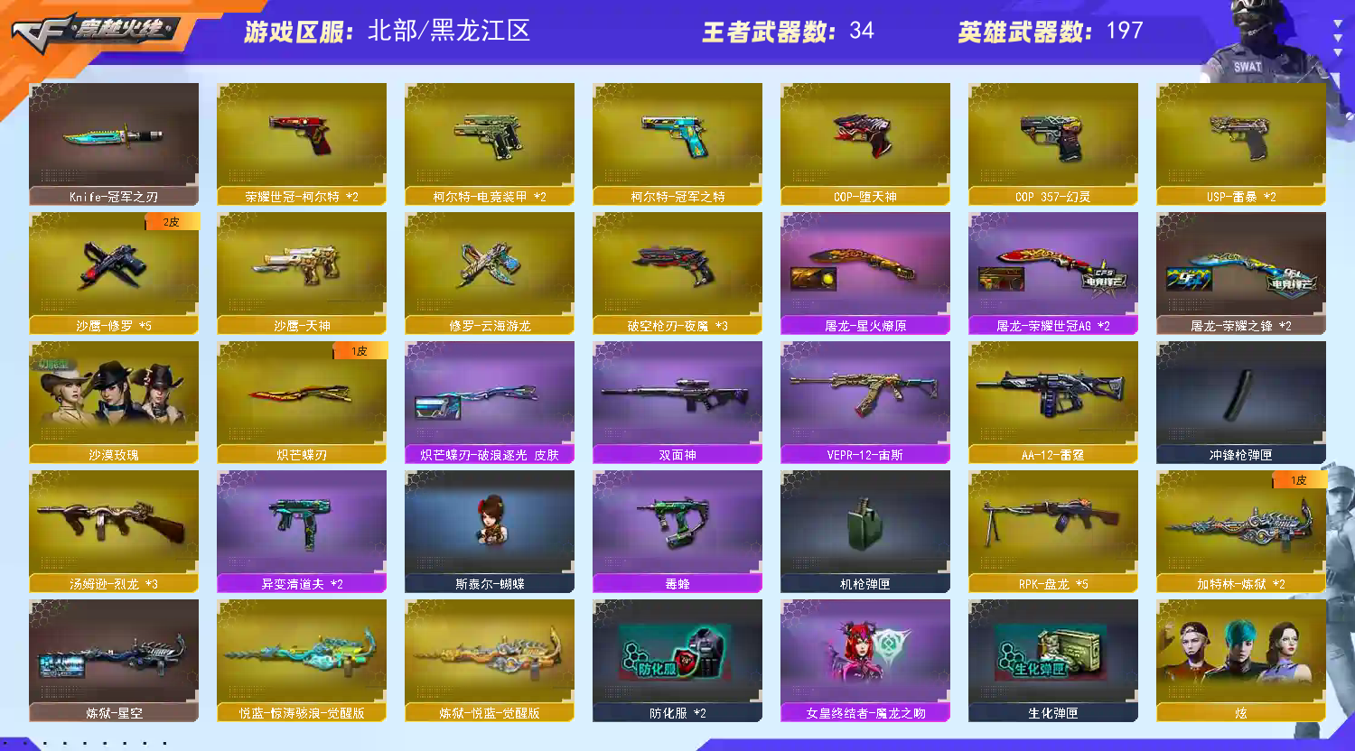 请勿开g;USP-雷暴,荣耀世冠-柯尔特,传说幽冥,柯尔特-冠军之特,炽芒蝶刃,Knife-冠军之刃,沙漠玫瑰,