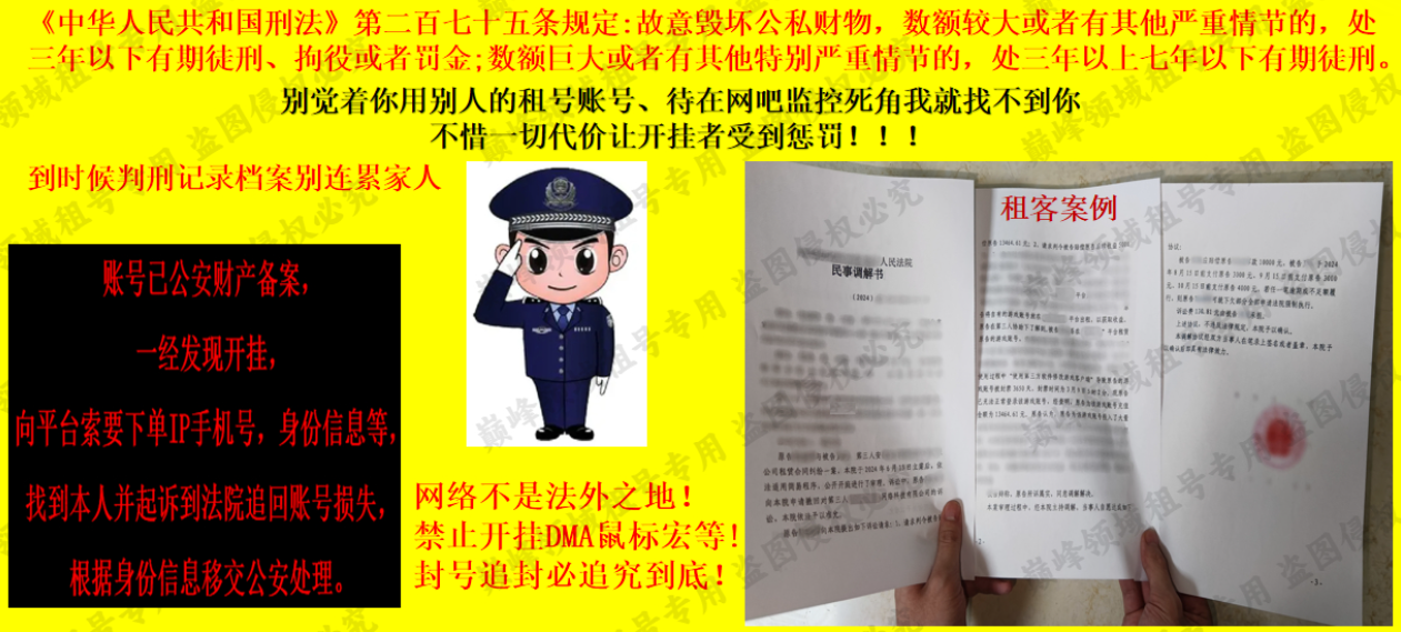 禁止盗图 侵权必究 ①安全分减2分以上拉黑 ②此号累计充值超过30+万,相关充值记录已在 济南市 公安处备案,如发现游戏账号被查封损坏等问题,构成犯罪并追究其法律责任!!! 平台方会配合警方协助调查,向平台索要下单IP手机号,身份信息等,实名找到本人并起诉到法院追回账号损失。 根据《刑法》第二百七十五条【故意毁坏财物罪】故意毁坏公私财物,数额较大或者有其他严重情节的,处三年以下有期徒刑、拘役或者罚金;数额巨大或者有其他特别严重情节的,处三年以上七年以下有期徒刑 ③遇到【登录不上需要验.证、冻结】问题,可以多试几次,如果还登录不上向号主发信息,号主及时解决 ④游戏前请【检查】钩子、(生化)弹夹等是否装备成功 |||||||||喜欢本账号请点 ☆收藏☆ 方便下次租用,谢谢光临惠顾|||||||||;USP-雷暴,荣耀世冠-柯尔特,炽芒蝶刃,沙漠玫瑰,传说影煞,晴雅,RPK-盘龙,