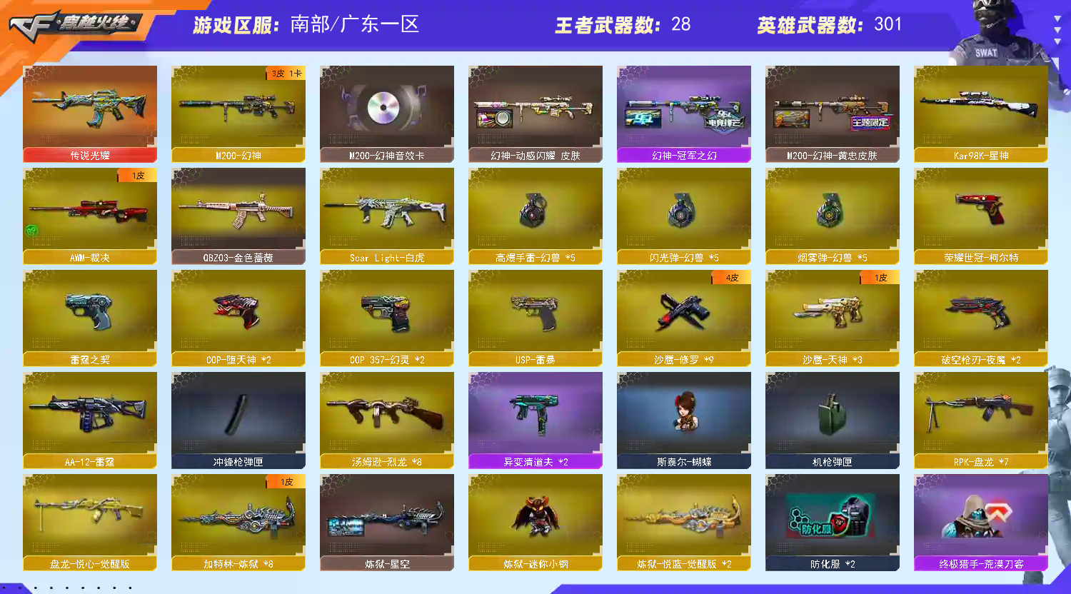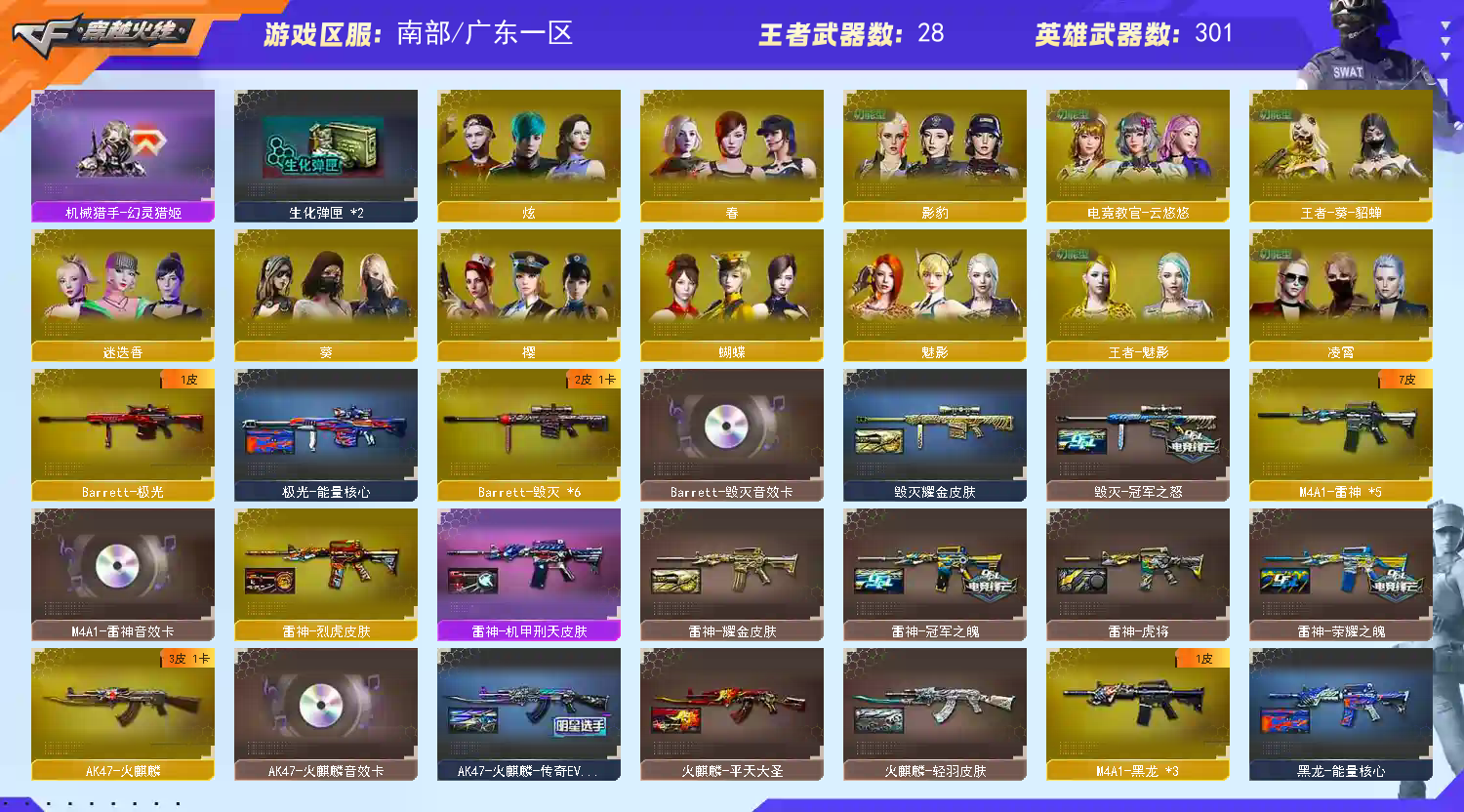 【温馨提示】此号价值数二十万,如有开G开辅助封号的,想想自己是否能够承担的起后果自负,由平台提供,身份信息,证据和地址进行报警处理!祝各位老板玩得开心。请使用官方启动,更快捷稳定上号。偶尔会异地冻结,显示暂时无法登陆,请维权更新密码,商品完成维权代表密码已更新,再次下单即可,带来不便,抱歉。恶意下单维权及检测到外挂将无法再次下单! 【游戏小贴士】官方启动高配置电脑分辨率调整144hz刷新率16:9比例1920*1080画面更清晰,设置好分辨率结束游戏重新打开游戏界面登录(不退游戏登录器)无黑屏,关闭击中效果,开启饰品确认玫击,游戏体验更佳。 【请租客爱护此号,当成自己号玩,喜欢请收藏,感谢】 【主武器》传说光耀序列号2455/M200-幻神/98K-星神/斯太尔蝴蝶/②异变清道夫/10炼狱/②炼狱悦蓝觉醒/⑥烈龙⑥盘龙/白虎/朱雀/幻灵/夜魔/千变/火麒麟/3黑龙/5雷神/⑥黑骑士/3无影/死神/3黑武士/2天启/2超新星/武圣/机械迷城/10黑鲨/10龙血/M4雷霆/②AK雷暴/M4堕天神/朱雀/③M4夜魔/m4幻灵/3玫瑰精灵/QBZ95-幻兽/蔷薇qbz/2猎神/烈火/王者之心觉醒/王者之武觉醒/王者之魄觉醒/王者之势觉醒/王者之幻觉醒/王者冰魄觉醒/王者炎心觉醒/王者火魄觉醒/荣耀世冠火麒麟/荣耀世冠雷神/身先士卒/常胜将军/天龙/6毁灭/极光/裁决/雷霆大炮/朱雀大炮/蔷薇大炮/王者之怒觉醒/王者之光觉醒/暗月传说大炮/AA12雷霆/雷神精英刀锋/火麒麟绝迹/火麒麟令狐/雷神小红/炫金火麒麟/炫金雷神/炫金黑龙/炫金千变/炫金骑士/天龙曼陀罗/王者之力/王者之怒/炫金毁灭/炼狱小刚/毁灭征服者超越Max/冰龙/激光毁灭者3/切割者3/机甲撕裂者3/巨龙咆哮3/神圣爆裂者+末日3/金魔/死亡之眼庆典CFS2021/CAT-刀锋/EVO赤血龙魂/a180蓝色骑士/ 【副武器】②COP357-幻灵/②COP堕天神/COP357-雷霆/荣耀世冠-柯尔特/USP-雷暴/⑤沙鹰幻兽/破空枪刃/②破空枪刃夜魔/武圣手枪/⑨修罗/③天神 【近身武器】⑦屠龙/17龙啸/②擎天/麒麟刺/尼泊尔雷霆/斩神刀雷暴/麒麟刺堕天神/2龙啸堕天神/马来剑夜魔/2幻灵之峰/擎天竞技荣光/女皇利刃幻兽/2王者之峰觉醒/②王者之击觉醒/荣耀世冠龙啸/冰龙/手斧镜 【角色】电竞教官云悠悠+四防/凌霄+四防/影豹+四防/迷迭香/绝版角色:蝴蝶/春/零/樱/选/魅影/王者魅影/王者葵貂蝉/灵狐者职业经理/空/兰海滩派对/零水下丽影/灵狐者黄金海岸/王者零传说之路/对讲机/炫彩背包/圣灵戒/魔龙戒 【手雷】迷你生化雷/⑤高爆幻兽+⑤烟闪/④套⑦高爆雷+烟闪/满手雷 【皮肤】幻神-冠军之幻皮肤/幻神-动感闪耀皮肤/幻神-黄忠皮肤/火麒麟-EVEN+AG战队皮肤/修罗-CFS2018皮肤/毁灭-CFS2018-冠军之怒+AGCFPLS15冠军+耀金皮肤/黑骑士-冠军之势+耀金皮肤/雷神-虎将+荣耀之魄+冠军之魄+机甲刑天+耀金皮肤/炼狱-星空皮肤/天龙白鲨皮肤 【音效卡】幻神音效卡/毁灭音效卡/雷神音效卡/火麒麟音效卡/黑骑士音效卡/烈龙云海游龙音效卡 【道具】紫金大元首/全背包/VIP/烟雾头/AC/闪光镜/钩子/防化服/变异宝贝/疯狂宝贝/灵魂忍者/迷雾幽灵/妖姬/伪装幽灵/全弹夹/终极猎手荒漠刀客皮肤/虚空终结者暗域熔岩皮肤/机械猎手幻灵猎姬皮肤/生化爆破全装;USP-雷暴,荣耀世冠-柯尔特,电竞教官-云悠悠,RPK-盘龙,QBZ03-金色蔷薇,M200-幻神,Scar Light-白虎,