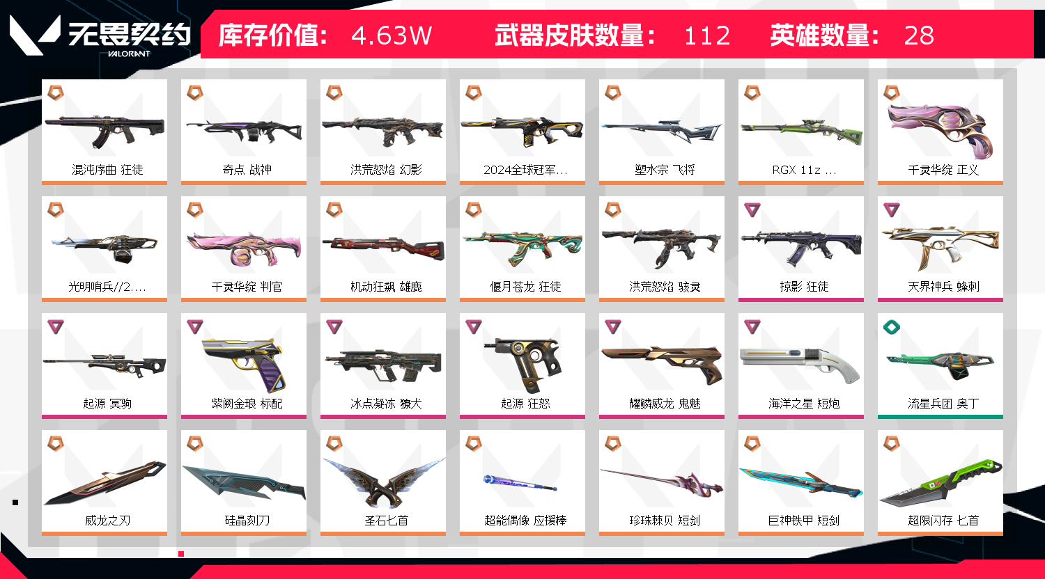 首页 > 租号大厅 > 无畏契约-wegame > wegame/wegame > 价值46300❤️106皮肤❤️25全角色❤️24冠军,rgx盲侠,光明奥丁,混沌AK,千灵喷子正义