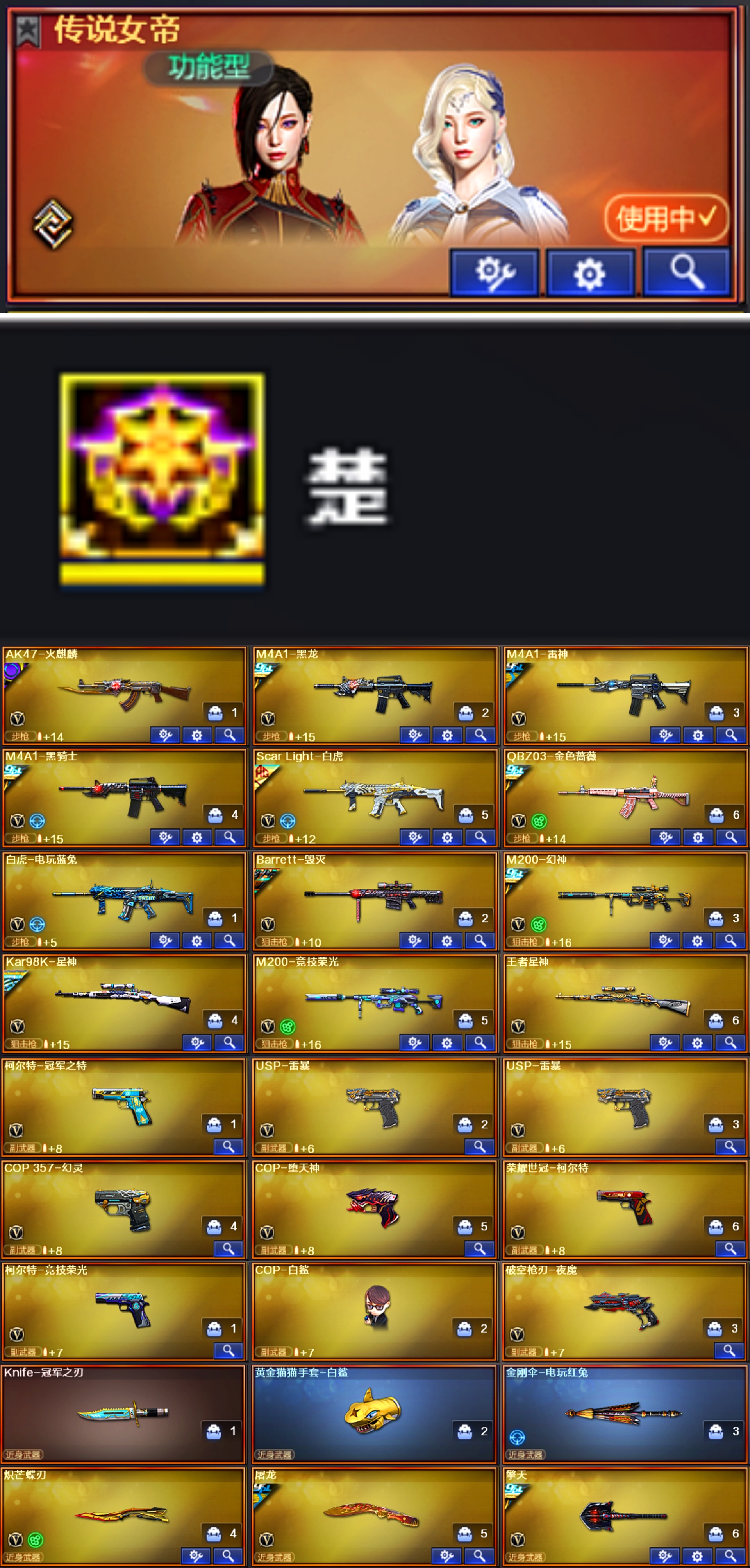 单ID(楚) 传说女帝♥幻神音效卡4皮冠军♥星神音效卡冠军♥QBZ冠军白虎AG♥6盘6烈毒蜂斯泰尔双
