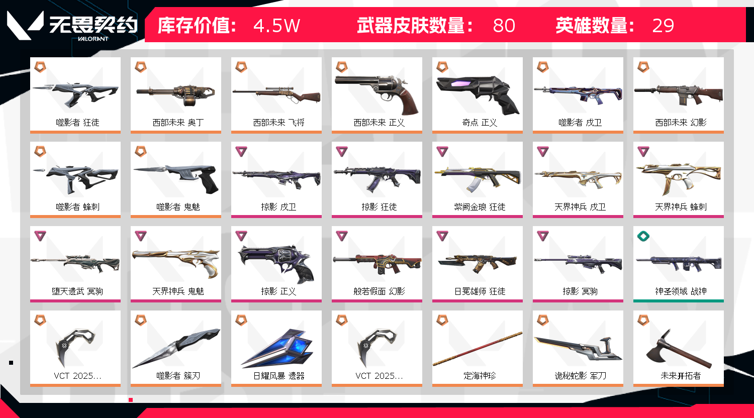 本号已进行虚拟财产登记,封号追究刑事责任。禁止利用账号进行开挂、使用辅助违规软件诈骗等违规行为。毁号行为涉及毁坏虚拟财产罪及计算机安全罪,请文明游戏素质游戏;西部未来 奥丁,VCT 2025 爪刀,掠影 戍卫,噬影者 狂徒,掠影 狂徒,紫阙金琅 狂徒,天界神兵 戍卫,