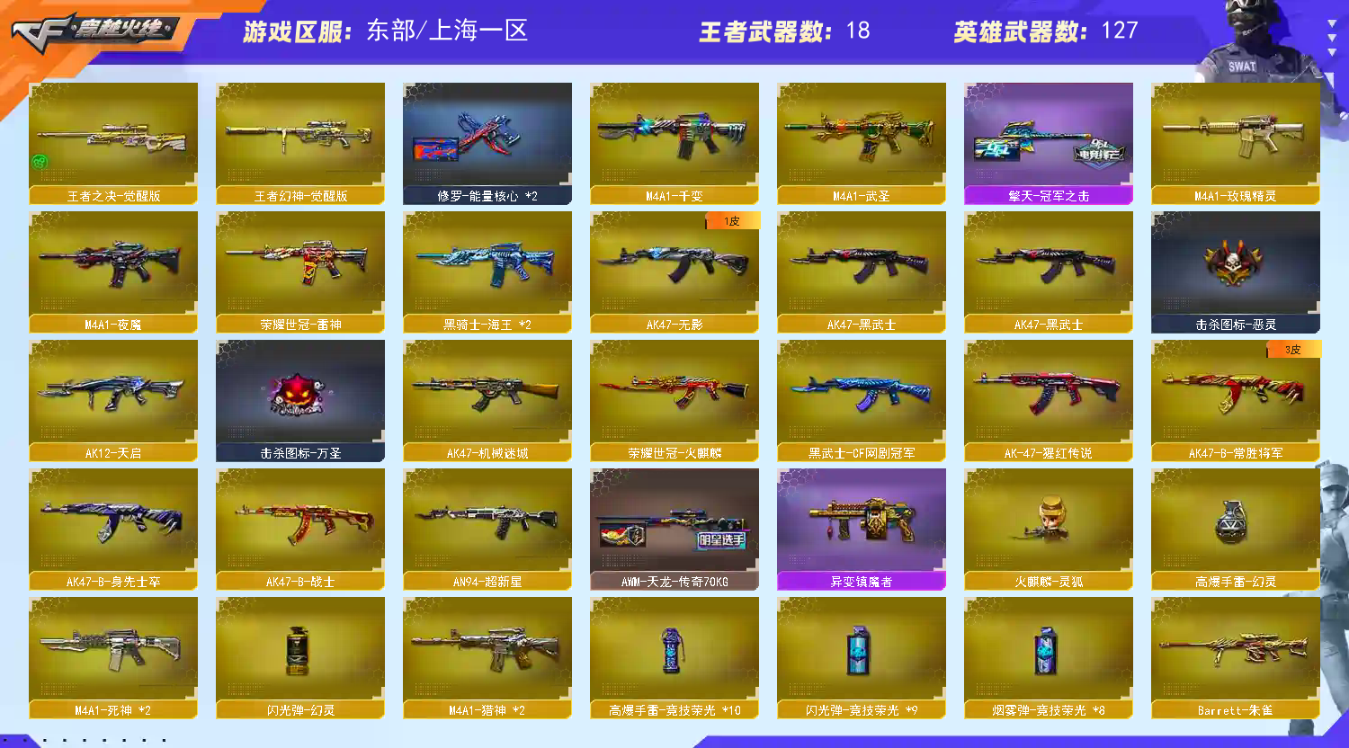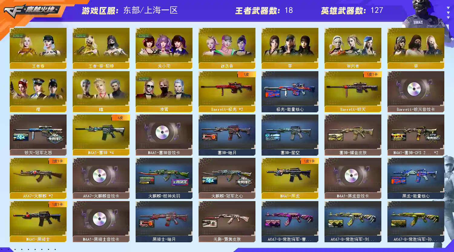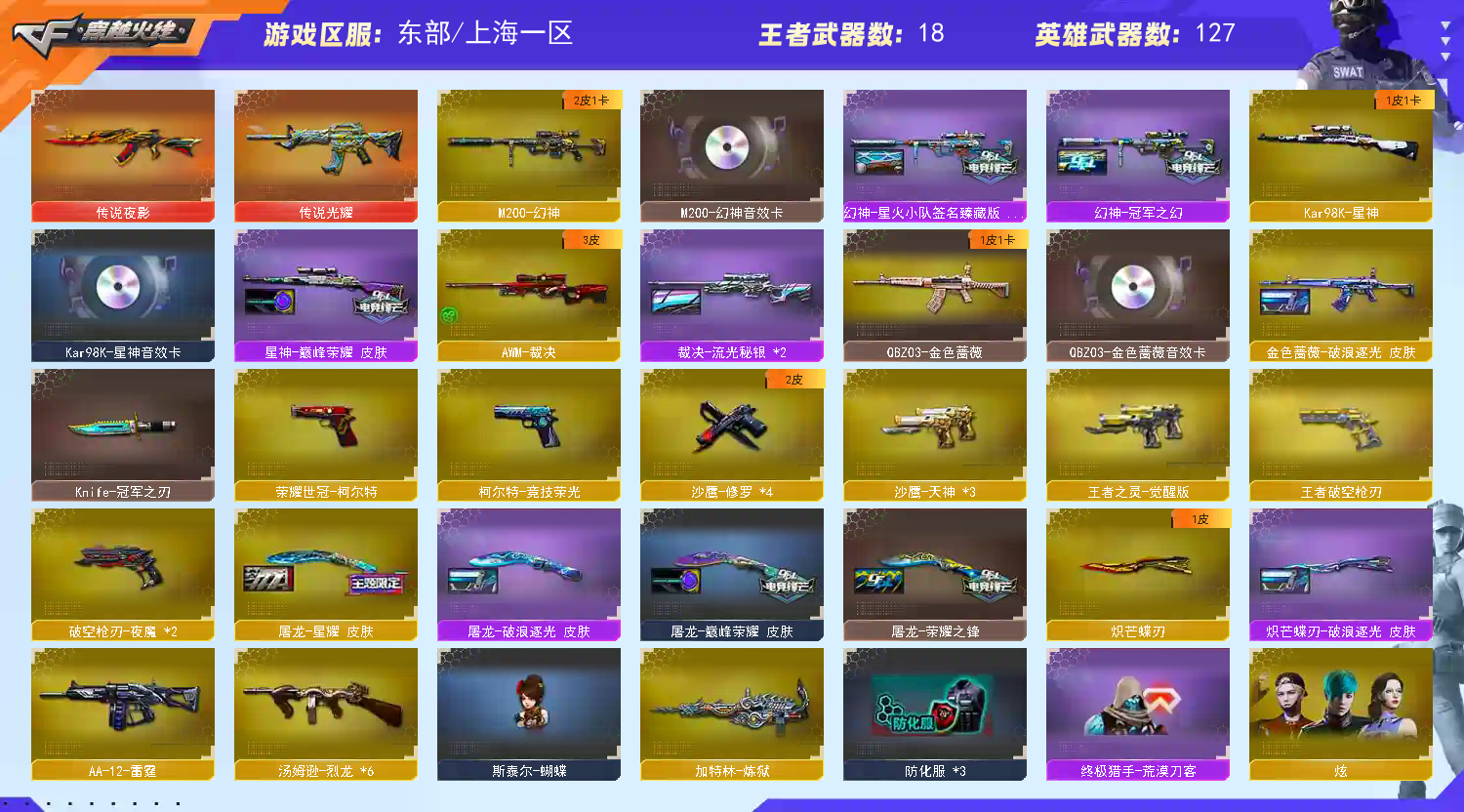传说夜影/传说光耀/幻神星火小队/幻神冠军之幻/星神巅峰荣耀 /毁灭冠军之怒/极光能量核心/天龙传奇70KG/天龙CFSTAR/裁决流光秘银/火麒麟CFSTAR/火麒麟战神关羽/审判者/_零/_葵/_樱/_瞳/M200-幻神/王者幻神-觉醒版/Barrett-毁灭/Barrett-极光(2)/Barrett-朱雀/荣耀世冠套装/网剧冠军套装/夜魔套装/Kar98K-星神音效卡/M200-幻神音效卡/M4A1-黑骑士音效卡/M4A1-黑龙音效卡/QBZ03-金色蔷薇音效卡/M4A1-雷神音效卡/Barrett-毁灭音效卡/AK47-火麒麟音效卡;荣耀世冠-柯尔特,炽芒蝶刃,Knife-冠军之刃,QBZ03-金色蔷薇,M200-幻神,Kar98K-星神,