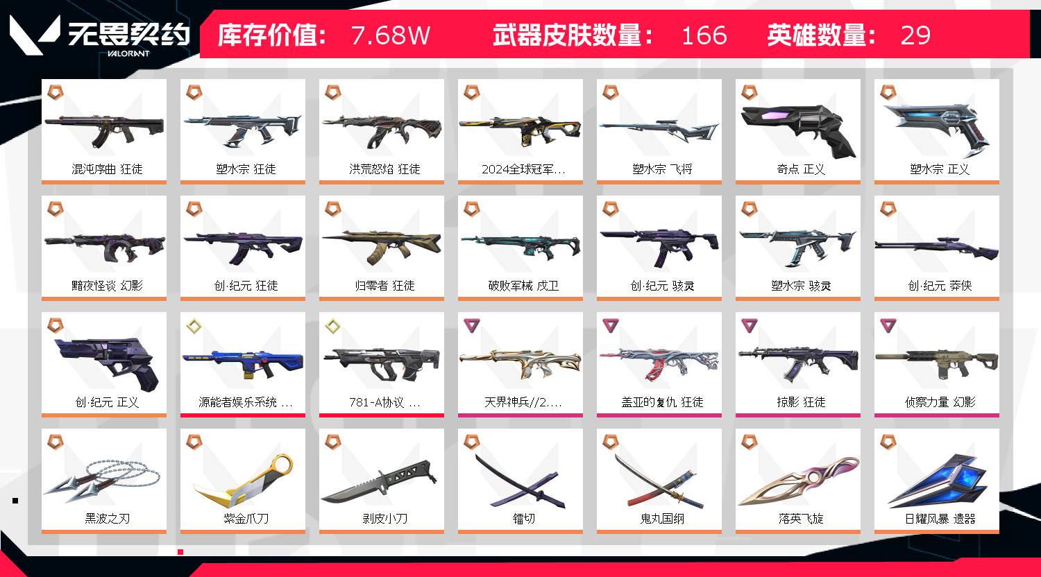英雄27 武器皮肤数量162;黑波之刃,紫金爪刀,剥皮小刀,镭切,天界神兵//2.0 幻影,盖亚的复仇 狂徒,洪荒怒焰 狂徒,