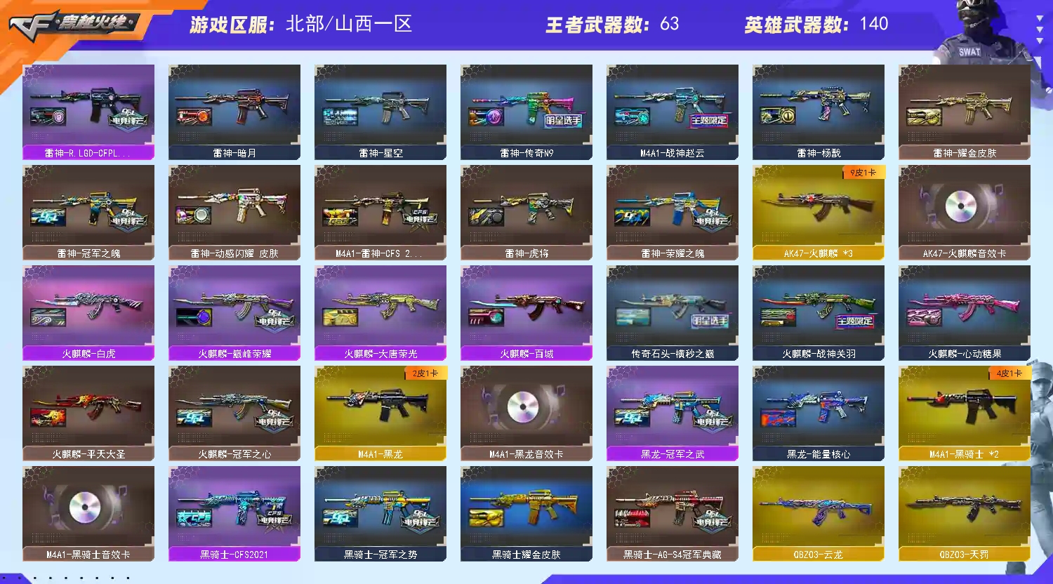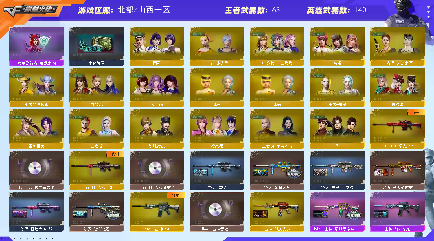 【亮点解析 热门北部四防双花 幻神三件套+10皮 98k星神三件套 步呛齐全 生化迷你小刚+四防生化角色 蓝天白云名片】 【四防传说女帝】 【四防传说艾莉沙】 【m200-幻神+音效卡+幻神-冠军之幻+幻神-宠儿+ag24冠军+幻神-丹凤+降龙+电流骇客+n92022mvp+幻神-青鹤+荣耀世冠白鲨+幻神-荣耀世冠白鲨2023】 【竞技荣光套+四防云悠悠+usp雷暴】 【98k星神+音效卡+冠军之星+漫游+98k星神-璀璨】 【传说光耀】 【传说夜影】 【g36c幻影】 【白虎之魄】 【scar白虎+音效卡+白鲨2023冠军+巅峰荣耀】 【qbz金色蔷薇+音效卡+cfs2024+荣耀世冠白鲨】 【云龙套】 【火麒麟+音效卡+火麒麟-呛娘+火麒麟-横秒之巅+火麒麟-冠军之心】 【黑龙+音效卡+黑龙-冠军之武】 【雷神+音效卡+烈虎+巅峰荣耀+雷神-lgd18冠军+雷神-传奇n9+雷神-荣耀之魄+雷神-冠军之魄】 【黑骑士+音效卡+黑骑士-冠军之势】 【毁灭+音效卡+毁灭-荣耀之怒+毁灭-冠军之怒】 【极光+音效卡】 【裁决+音效卡+异化之源】 【王者之心 王者之心 王者之翼 王者之魄 王者之势 王者之戮 王者之势 王者冰魄】 【千变 无影 天启 超新星 机械迷城 黑鲨 青龙 hk417-朱雀 玄武 天罚+音效卡】 【生化 5盘龙 2炼狱 5烈龙 蝴蝶刀+荣耀世冠白鲨2023 迷你小钢】 【16近战 修罗 天神*3 usp雷暴 cop云龙 柯尔特无冕之王 cop雷霆王者*2 冠军之特】 【27近战 冠军之刃*2 屠龙*2 龙啸 擎天*2 麒麟刺*2 炽芒蝶刃蝴蝶刀 云龙扇 王者之击 王者之刺】 【手雷 堕天神*2 竞技荣光*4 云龙雷*7 雷霆王者*4】 【四防 毒蝰术士 华 呛娘樱 晴雅 岚兮儿 雨墨 王者迷迭香 王者魅影 王者葵惊若翩鸿 王者炫 王者沙漠玫瑰】 【炫彩背包 动感闪耀炫彩背包 bs炫彩背包】 【幻神音效卡 98k星神音效卡 裁决音效卡】;USP-雷暴,柯尔特-无冕之王,荣耀世冠-柯尔特,柯尔特-冠军之特,炽芒蝶刃,Knife-冠军之刃,传说女帝,
