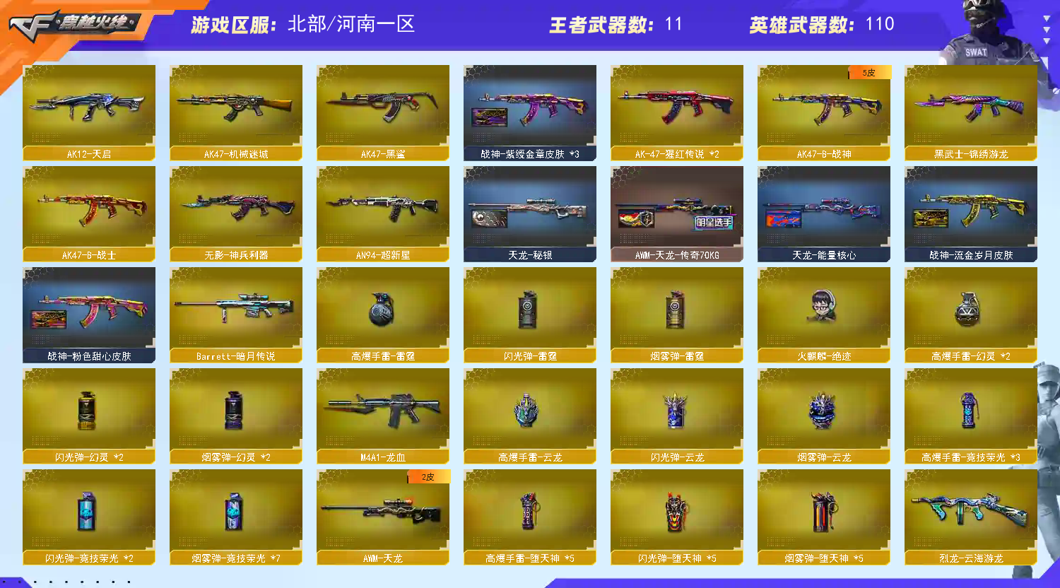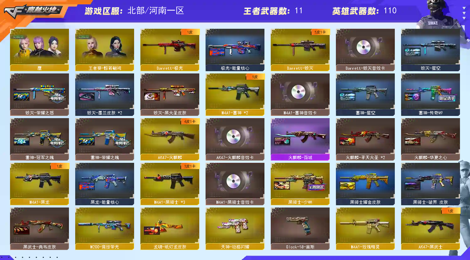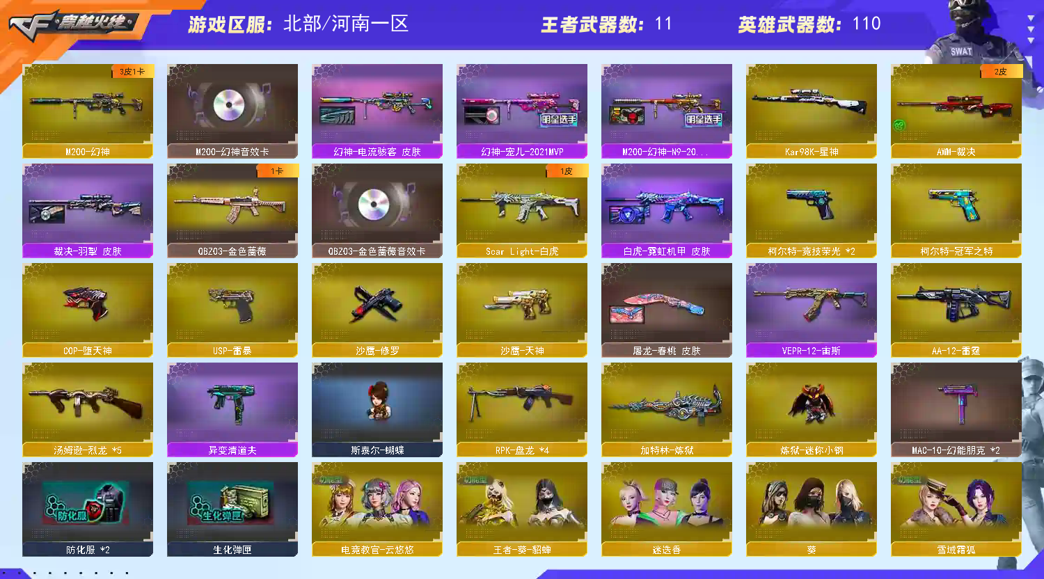 【m200幻神+音效卡+宠儿皮肤+n9皮肤+电流骇客+冠军之特】【98k星神】【m200竞技荣光套+usp雷暴+四防云悠悠】【6烈龙 盘龙*4 炼狱 擎天柱 斯太尔蝴蝶 臻选套】【scar白虎】【qbz金色蔷薇+卡】【火麒麟+卡】【黑龙】【雷神+卡+白鲨冠军+冠军之魄+荣耀之魄+n9皮肤】【黑骑士+卡+少林】【毁灭+卡+ag15冠军+荣耀之怒】【极光】【裁决 】 【武器:王者之心 王者之戮 王者之幻 王者冰魄 】 【7手呛:修罗 天神 usp雷暴 堕天神 冠军之15刀具:屠龙 龙啸 擎天 麒麟刺 尼泊尔雷霆 王者之锋 】 【8雷套:雷霆雷 堕天神雷*5 竞技荣光雷*2】 【小人呛:雷神精英刀锋 火麒麟绝迹 裁决雪莉杨 炼狱小刚】 【音效卡: 黑骑士音效卡 火麒麟音效卡 金色蔷薇音效卡 雷神音效卡 毁灭音效卡 幻神音效卡 】 【四防角色:云悠悠 鹰 王者葵貂蝉 王者葵惊若翩鸿 】;USP-雷暴,柯尔特-冠军之特,电竞教官-云悠悠,RPK-盘龙,QBZ03-金色蔷薇,M200-幻神,Scar Light-白虎,
