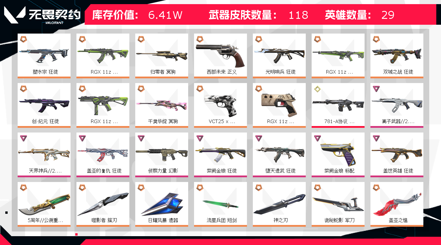 喜欢的老板,麻烦点点收藏,下次租玩更便利,持续更新皮肤中~~~ 【皮肤资产价值】64060 【使用R点】1345 【英雄数量】17 【皮肤数量】113 【卡面数量】129 【喷漆数量】125 【挂件数量】90 【拥有套装】RGX-11z-Pro套装(RGX-11z-Pro-狂徒,RGX-11z-Pro-戍卫,RGX-11z-Pro-蜂刺,RGX-11z-Pro-狂怒,RGX-11z-Pro-战刀)神中神罚套装(神中神罚-幻影,神中神罚-莽侠,神中神罚-骇灵,神中神罚-狂怒,神之刃) 【拥有近战武器】5周年//公测重制版-苍龙之刃,日耀风暴-遗器,诡秘蛇影-军刀,神圣领域-战刀,荒土机兵-热能刀,流星兵团-短剑,噬影者-簇刃,盖亚之愠,冰点凝冻-动力锤,穿花蝴蝶, 【拥有步枪】创·纪元-狂徒,光明哨兵-狂徒,双城之战-狂徒,塑水宗-狂徒,781-A协议-幻影,离子武器//2.0-狂徒,堕天遗武-狂徒,天界神兵//2.0-幻影,盖世英雄-狂徒,紫阙金琅-狂徒,盖亚的复仇-狂徒,侦察力量-幻影,冰点凝冻-狂徒,般若假面-幻影,日冕雄师-狂徒,日耀风暴-幻影,诡秘蛇影-狂徒,神圣领域-獠犬,神圣领域-幻影,荒土机兵-狂徒,超能偶像-戍卫,超能偶像-狂徒,流星兵团-狂徒,幻语魔咒-獠犬,甜蜜战术-戍卫,末日之翼-幻影,折光棱晶-戍卫,月球哨兵-戍卫,纳米击-幻影,逆冲蛮牛-戍卫,逆冲蛮牛-獠犬,聚合之力-幻影,采蜜小蜂队-獠犬,战术熊与伙伴们-戍卫, 【拥有狙击枪】千灵华绽-冥驹,归零者-冥驹,盖世英雄-冥驹,诡秘蛇影-莽侠,荒土机兵-冥驹,甜蜜战术-冥驹,幻语魔咒-飞将,末日之翼-飞将,星云暗涌-冥驹,月球哨兵-莽侠,聚合之力-飞将,战术熊与伙伴们-飞将,纤云弄巧-莽侠, 【拥有机枪】日耀风暴-奥丁,神圣领域-战神,流星兵团-奥丁,末日之翼-奥丁,纳米击-奥丁,采蜜小蜂队-战神, 【拥有冲锋枪】日耀风暴-骇灵,荒土机兵-骇灵,流星兵团-骇灵,折光棱晶-蜂刺,星云暗涌-骇灵,星云暗涌-蜂刺,聚合之力-蜂刺,纤云弄巧-蜂刺, 【拥有霰弹枪】诡秘蛇影-判官,超能偶像-判官,甜蜜战术-判官,幻语魔咒-雄鹿,月球哨兵-雄鹿,逆冲蛮牛-雄鹿,纳米击-判官,采蜜小蜂队-判官, 【拥有手枪】VCT25-x-TS-标配,西部未来-正义,紫阙金琅-标配,耀鳞威龙-鬼魅,日耀风暴-正义,诡秘蛇影-鬼魅,神圣领域-狂怒,荒土机兵-标配,流星兵团-鬼魅,甜蜜战术-鬼魅,幻语魔咒-狂怒,折光棱晶-标配,末日之翼-短炮,星云暗涌-鬼魅,月球哨兵-正义,最终庇护-标配,纳米打-正义,逆冲蛮牛-狂怒,聚合之力-狂怒,采蜜小蜂队-鬼魅,纤云弄巧-正义,战术熊与伙伴们-标配,纤云弄巧-短炮,战术熊与伙伴们-狂怒, 【稀有挂件】V25第三幕铂金挂饰,薰衣草之心挂饰,金属蝶翼挂饰,第九季黄金挂饰,终章猫猫木乃伊挂饰,猫猫木乃伊挂饰,熔岩灯挂饰,糖葫芦挂饰,袖珍捷风挂饰,超能偶像挂饰,迷你浓缩挂饰,采蜜小蜂队挂饰,第八季白银挂饰,终章迷你机甲挂饰,战术河童挂饰,迷你机甲挂饰,章鱼烧先生挂饰,云开见日挂饰,章鱼小弟挂饰, 【卡面信息】情人节猎枭卡面,神射企卡面,分崩离析卡面,双城之战拥抱卡面,超能偶像卡面,24冠军混沌黯夜怪谈艾沃莉源能者电玩显卡套塑水宗归零者盖世套光明哨兵机动狂飙全息波普破败军械掠夺掠影无畏奇点2.0白银青铜黄金黑铁砖石铂金神话盖亚洪荒离火刃毁灭骑士VCT爪刀创纪元镭切虚空遗器离子2.0西部未来蝴蝶刀黑波显卡AK无畏光荣异象RGX 11Z PRO奇点正义23盖亚铂金22冠军苍龙之刃21冠军超时空卫士掠影2.0影钩赋能掠夺爪显卡AK滋滋X特工队25冠军;5周年//公测重制版 苍龙之刃,天界神兵//2.0 幻影,盖亚的复仇 狂徒,侦察力量 幻影,紫阙金琅 狂徒,RGX 11z Pro 狂徒,堕天遗武 狂徒,
