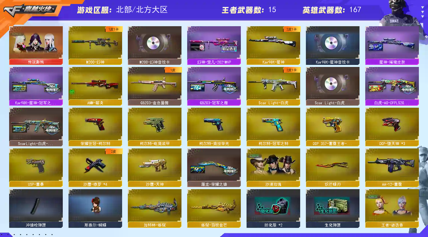 【王者武器】:【炫金武士-1,炫金火麒麟-1,炫金无影-2,炫金雷神-1,王者之魄高爆手雷-1,王者之魄闪光弹-1,王者之魄烟雾弹-1,COP 357-雷霆王者-觉醒版-1,王者之击-觉醒版-1,王者之啸-觉醒版-1,王者之心-觉醒版-1,王者之翼-觉醒版-1,王者之锋-觉醒版-1,王者之魄-觉醒版-1,王者冰魄-觉醒版-1,王者森决-觉醒版-1,炫金骑士-1】 【英雄武器】:【M4A1-死神-2,M4A1-黑骑士-1,AK47-黑武士-1,屠龙-2,龙啸-1,AK47-无影-2,麒麟刺-1,AK47-火麒麟-2,Barrett-毁灭-1,Barrett-极光-2,沙鹰-修罗-4,加特林-炼狱-1,沙鹰-天神-1,M4A1-雷神-2,M4A1-黑龙-2,9A91-烈火-2,M200-幻神-1,USP-雷暴-1,高爆手雷-雷暴-5,闪光弹-雷暴-5,烟雾弹-雷暴-5,斩神刀-雷暴-1,Barrett-电竞装甲-1,M200-竞技荣光-1,尼泊尔-电竞装甲-3,恶棍-电竞装甲-7,擎天-竞技荣光-2,柯尔特-冠军之特-1,柯尔特-电竞装甲-1,柯尔特-竞技荣光-1,烟雾弹-电竞装甲-7,烟雾弹-竞技荣光-7,闪光弹-电竞装甲-7,闪光弹-竞技荣光-8,高爆手雷-竞技荣光-8,Scar Light-白虎-1,高爆手雷-夜魔-3,马来剑-夜魔-1,闪光弹-夜魔-3,烟雾弹-夜魔-3,炽芒蝶刃-1,AK-47-猩红传说-1,无影-神兵利器-1,AA-12-雷霆-1,Barrett-暗月传说-1,QBZ03-金色蔷薇-1,HK417-朱雀-1,Kar98K-星神-1,擎天-2,M4A1-堕天神-1,COP-堕天神-3,AWM-裁决-1,高爆手雷-堕天神-6,龙啸-堕天神-2,麒麟刺-堕天神-4,闪光弹-堕天神-6,烟雾弹-堕天神-6,AK47-雷暴-1,AK47-B-常胜将军-1,AK47-B-身先士卒-1,荣耀世冠-柯尔特-1,荣耀世冠-雷神-1,黑骑士-海王-1,AK47-B-战神-1,AK47-B-战士-1,M4A1-龙血-3,Barrett-朱雀-2】 【装饰品】:【雷神-能量核心-1,极光-能量核心-1,修罗-能量核心-1,王者刀锋玩偶-1,金色幸运鼠玩偶-1,雷神-宠儿-2019MVP-1,哪吒玩偶-1,M4A1-战神赵云-1,火麒麟-平天大圣-1,雷神-虎将-1,火麒麟-心动糖果-1,无影耀金皮肤-1,雷神-星空-1,毁灭-星空-1,白虎-AG-CFPLS20冠军-1,白虎-电玩粉兔皮肤-1,QBZ03-冠军之薇-1,战神-粉色甜心皮肤-1,战神-流金岁月皮肤-1,战神-紫绶金章皮肤-1,AK47-B-常胜将军-曹操-1,AK47-B-常胜将军-刘备-1,屠龙-荣耀之锋-1,修罗-星空-1,幻神-宠儿-2021MVP-1,星神-璀璨皮肤-1,擎天-冠军之击-1,毁灭-BEAN-2020MVP-1,毁灭-CFS2020-1,雷神-冠军之魄-1,CFS 击杀图标-1,毁灭-SV-CFPLS16冠军-1,零-水下丽影玩偶-1,王胖子玩偶-1,雷神-源计划2.0专属 皮肤-1,白泽玩偶-1,蝴蝶玩偶-1,孙尚香玩偶-1】 【角色】:【魅影,金戈,瞳,堕天使,复仇者,雷霆-β,铁骑,猎狐者,夜玫瑰,活力灵狐,兰,灵狐者,嘉年华灵狐,娜塔莉娅,救世主,王力宏,鹰,电竞教官-云悠悠,王者-迷迭香,王者-瞳-闭月羞花,圣诞潘多拉-X,救世主-X,剑齿虎-X,枪娘樱,风暴女,陈龙野,陈龙野-Y,精英部队,烈锋,猎狐者-X,斯沃特精英,空,潘多拉-甜心教官,娟娟,紫霞,潜龙队-X,娜塔莎,麻雀,雪莉杨,芳心审判者,社长刀锋,灵动武士,沙漠玫瑰,职业选手,猎狐者-追月,灵狐-花神,蜀雪,幽,传说影煞,甜心偶像】 【道具】:【超级背包-1,金蛇戒-1,烟雾保护头盔-1,闪光护目镜-1,防弹衣-1,防弹头盔-1,手雷包-1,C4工具钳-1,防化服-1,夺命之镰-1,灵魂忍者-1,疯狂宝贝-1,迷雾幽灵-1,生化弹匣-1,步枪弹匣-1,机枪弹匣-1,冲锋枪弹匣-1,Barrett-毁灭音效卡-1,枪娘语音包-阿敏-1,M4A1-黑骑士音效卡-1,M200-幻神音效卡-1,小兔皮-1,Scar Light-白虎音效卡-1,变相怪杰-1,天使之翼-1,绿色巨人-1,黄金头骨护目镜-1,兔子发带-1,Kar98K-星神音效卡-1,大圣背包-1,大圣头盔-1】;USP-雷暴,荣耀世冠-柯尔特,柯尔特-冠军之特,炽芒蝶刃,沙漠玫瑰,传说影煞,电竞教官-云悠悠,