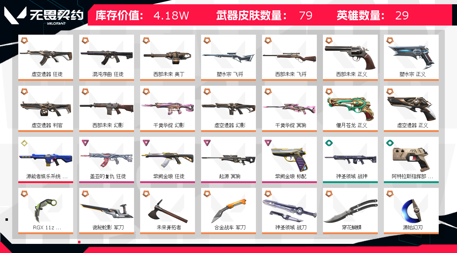 4.2w显卡爪刀/虚空套/西部套/混沌狂徒/蝴蝶刀/千灵幻影和冥狗/塑水正义和飞将/盖亚金狼狂徒/起源冥狗;西部未来 奥丁,盖亚的复仇 狂徒,虚空遗器 狂徒,源能者娱乐系统 幻影,紫阙金琅 狂徒,混沌序曲 狂徒,塑水宗 飞将,