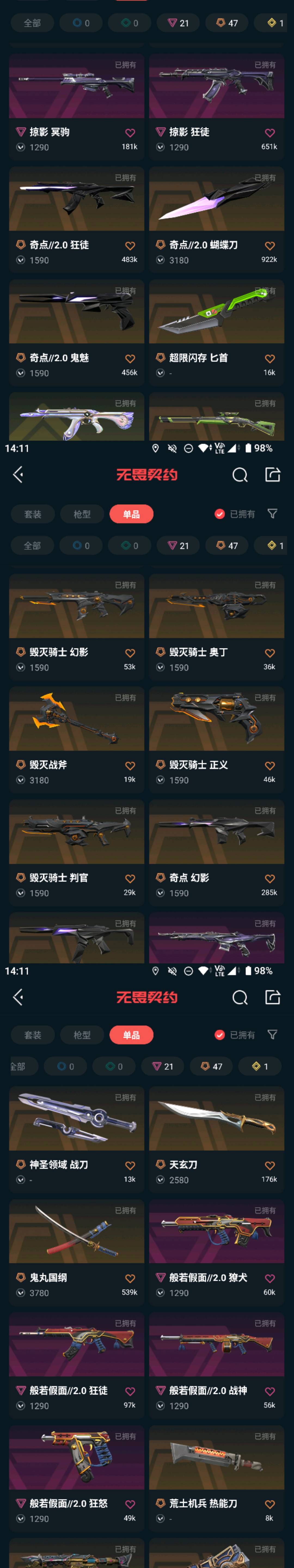 11万余额!双城之战套 毁灭骑士套 掠夺1.0套 奇点回归套 黯夜怪谈套等,还有多个套装,单品