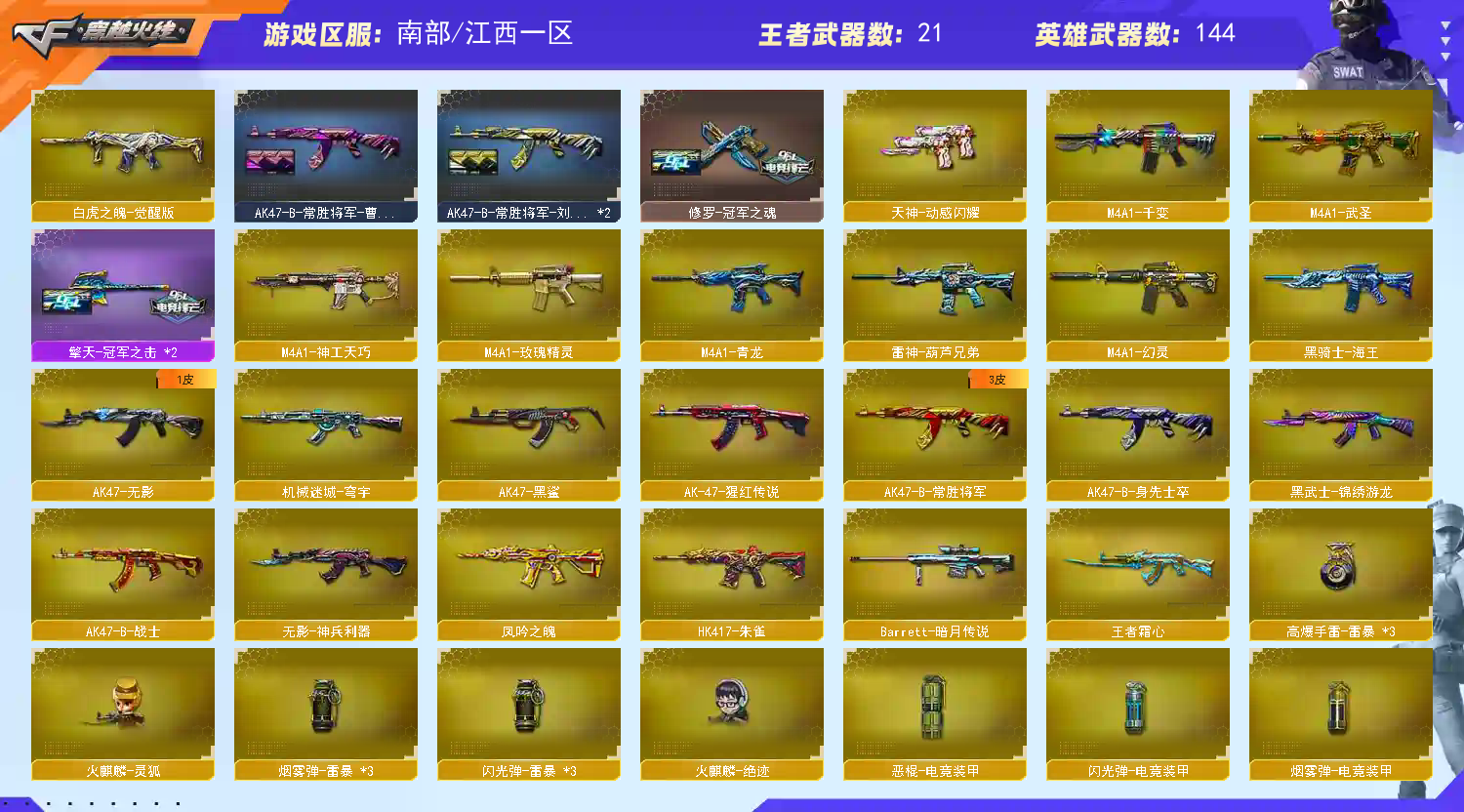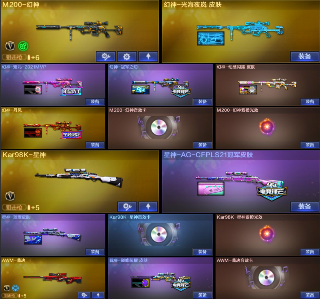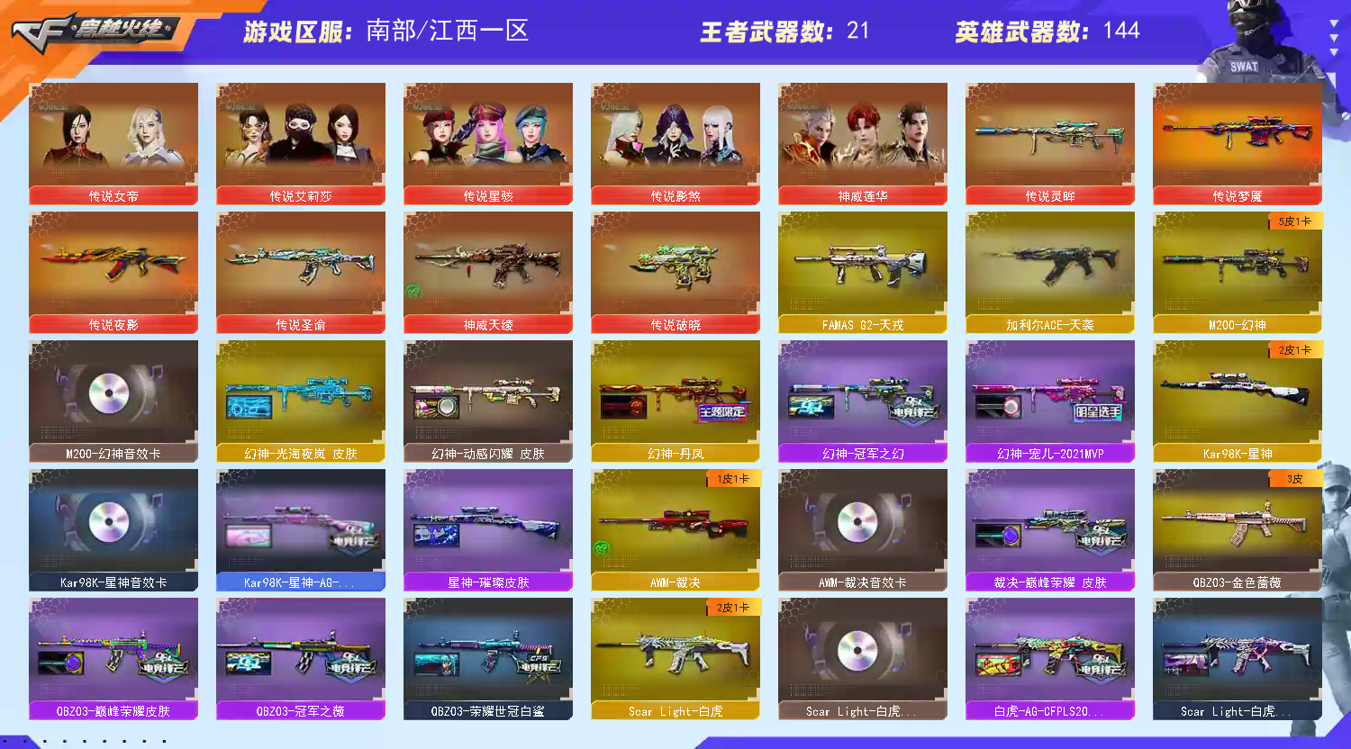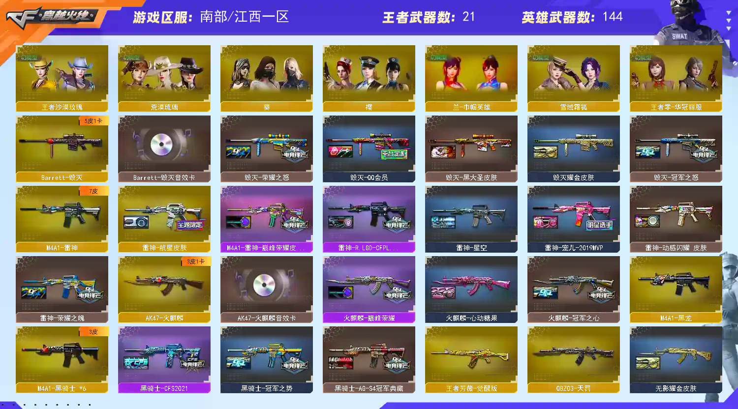 【稀有武器】:传说夜影/传说梦魇/传说灵眸/传说破晓/M200-幻神/Kar98K-星神/VSK-94-金蚀/G36C-幻影/ScarLight-白虎/M14EBR-玄武/M4A1-青龙/HK417-朱雀/QBZ03-天罚/M4A1-幻灵/M4A1-神工天巧/柯尔特-电竞装甲(2)/COP357-幻灵(3)/USP-神工天巧(4)/天神-动感闪耀/荣耀世冠-柯尔特/柯尔特-冠军之特/QBZ03-金色蔷薇/AK47-火麒麟/M4A1-黑龙/M4A1-雷神/M4A1-黑骑士(6)/Barrett-毁灭/AWM-裁决/RPK-盘龙(6)/加特林-炼狱/汤姆逊-烈龙(6)/AA-12-雷霆(2)/炽芒蝶刃/斩神刀-雷暴/幻灵之锋/唐刀-神工天巧 【王者武器】:王者之心-觉醒版/白虎之魄-觉醒版/王者芳薇-觉醒版 【热门角色】:传说女帝/传说艾莉莎/传说影煞/荒漠琉璃/兰-巾帼英雄/晴雅/影豹/乔伊教练/王者沙漠玫瑰/灵狐者-职业经理/幽/职业选手 【热门音效卡】:M200-幻神音效卡/Kar98K-星神音效卡/Scar Light-白虎音效卡/HK417-朱雀音效卡/加特林-炼狱音效卡/QBZ03-天罚音效卡/Barrett-毁灭音效卡/AK47-火麒麟音效卡 【热门皮肤】:幻神-宠儿-2021MVP/幻神-冠军之幻/幻神-动感闪耀皮肤/幻神-丹凤/裁决-巅峰荣耀皮肤/M4A1-雷神-巅峰荣耀皮肤/QBZ03-巅峰荣耀皮肤/雷神-R.LGD-CFPLS18冠军/屠龙-荣耀世冠AG/擎天-冠军之击(2)/火麒麟-巅峰荣耀/QBZ03-冠军之薇/星神-璀璨皮肤/白虎-AG-CFPLS20冠军/QBZ03-荣耀世冠白鲨/雷神-宠儿-2019MVP/火麒麟-冠军之心/毁灭-冠军之怒/黑骑士-AG-S4冠军典藏/毁灭-荣耀之怒/龙啸-冠军之啸/雷神-荣耀之魄 【其他亮点】:斯泰尔-蝴蝶/炼狱-迷你小钢/Knife-冠军之刃(2)/毒蜂/异变清道夫/黄金猫猫手套-白鲨;USP-雷暴王者,荣耀世冠-柯尔特,柯尔特-冠军之特,炽芒蝶刃,Knife-冠军之刃,传说影煞,传说星骇,