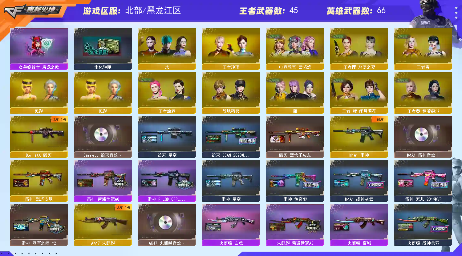 【温馨提示】此号价值数十万,已向公安机关报备,如有开G开辅助封号的,由平台提供,身份信息证据和地址进行报警处理并依法追究.账号开挂追责 后台看的一清二楚!!!! 不要有侥幸心理 开挂是犯罪行为!!!!恶意撤单退排位永久拉黑幻神新AGCFPLS24冠军 裁决巅峰荣耀三件套 王者星神 王者之决 白虎 usp雷暴 冠军之特 冠特 幻灵 雷霆王者 王者风神 幻神宠儿 白鲨 青鹤 裁决羽掣 雷神宠儿 传奇N9 冠军之薇 荣耀世冠白鲨 2传说艾莉莎 传说梦魇 裁决音效卡 幻神音效卡 黑骑士音效卡 黑龙音效卡 qbz03金色蔷薇音效卡 白虎音效卡 雷神音效卡 毁灭音效卡 火麒麟音效卡 mac-10-龙宝 牛牛-AK47 cat刀锋;USP-雷暴,荣耀世冠-柯尔特,柯尔特-冠军之特,隼,电竞教官-云悠悠,传说艾莉莎,QBZ03-金色蔷薇,