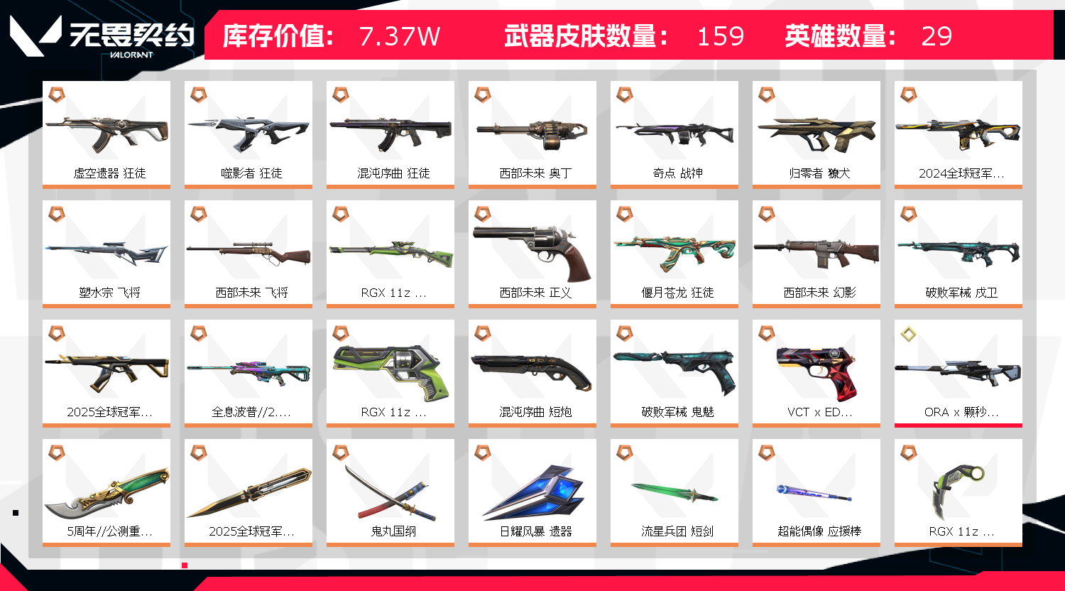 首页 > 租号大厅 > 无畏契约-wegame > wegame/wegame > 73740点券号,颗秒套一25冠军套显卡爪刀套少爷套,基本上所有枪都有特效皮肤