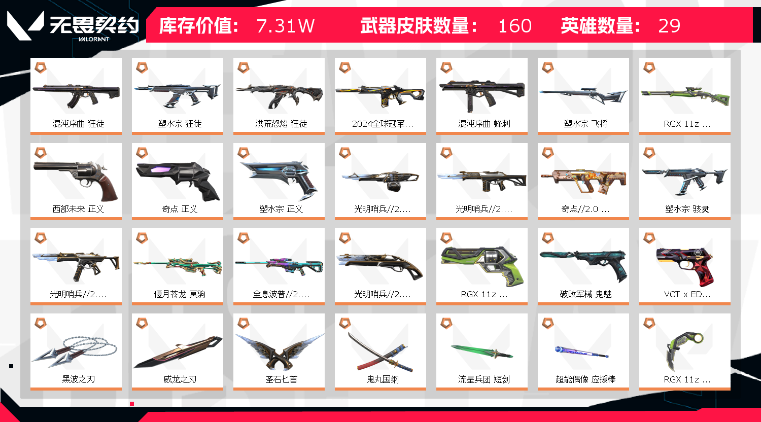 首页 > 租号大厅 > 无畏契约-wegame > wegame/wegame > 精氪158皮✨黑波✨蝴蝶✨显卡爪刀✨鬼丸✨盖亚复仇✨混沌✨塑水宗套✨猫猫✨侦查力量✨6套装✨