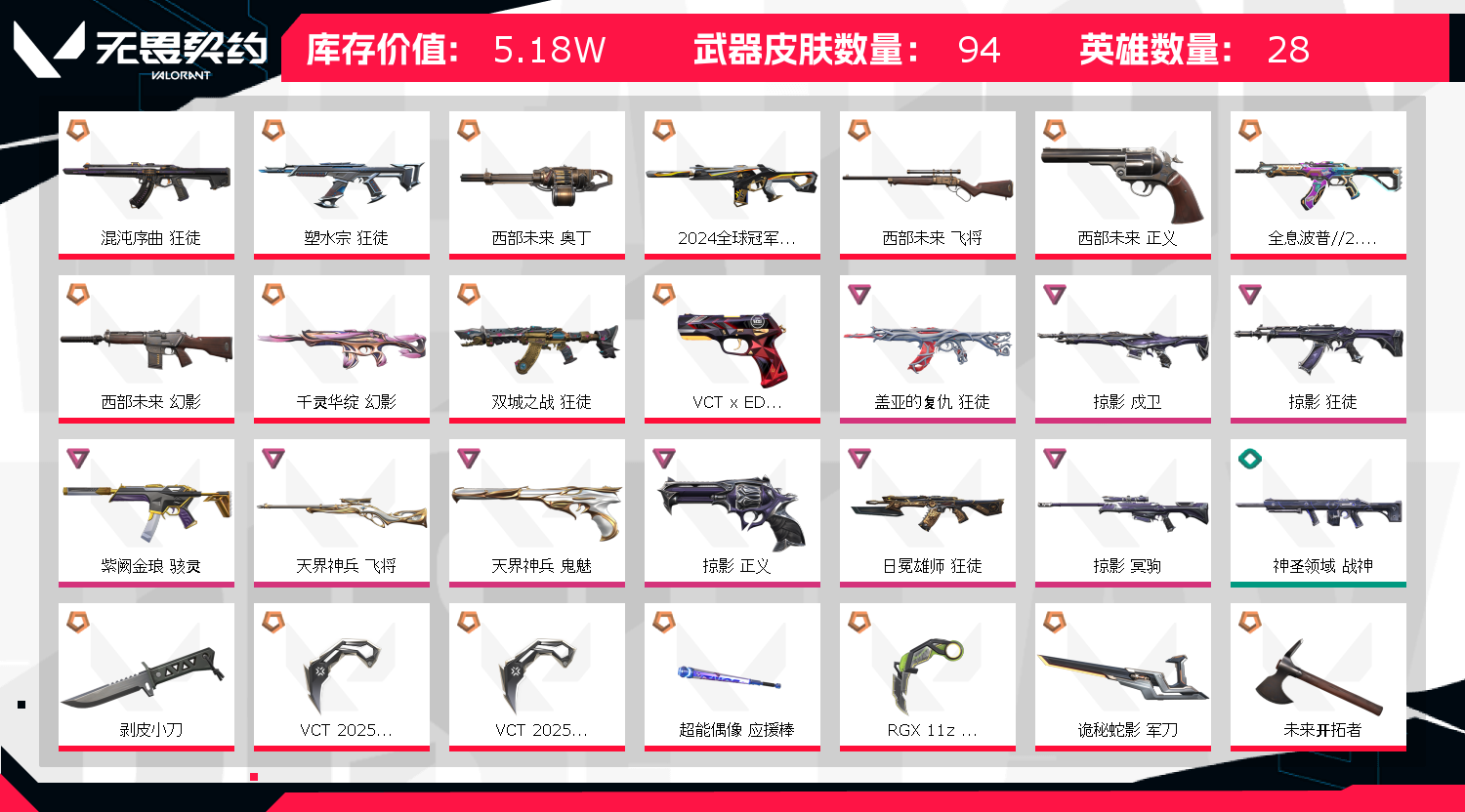 5w库存/2024冠军赛全套/西部未来全套/剥皮小刀/塑水宗 狂徒/VCT 2025 爪刀