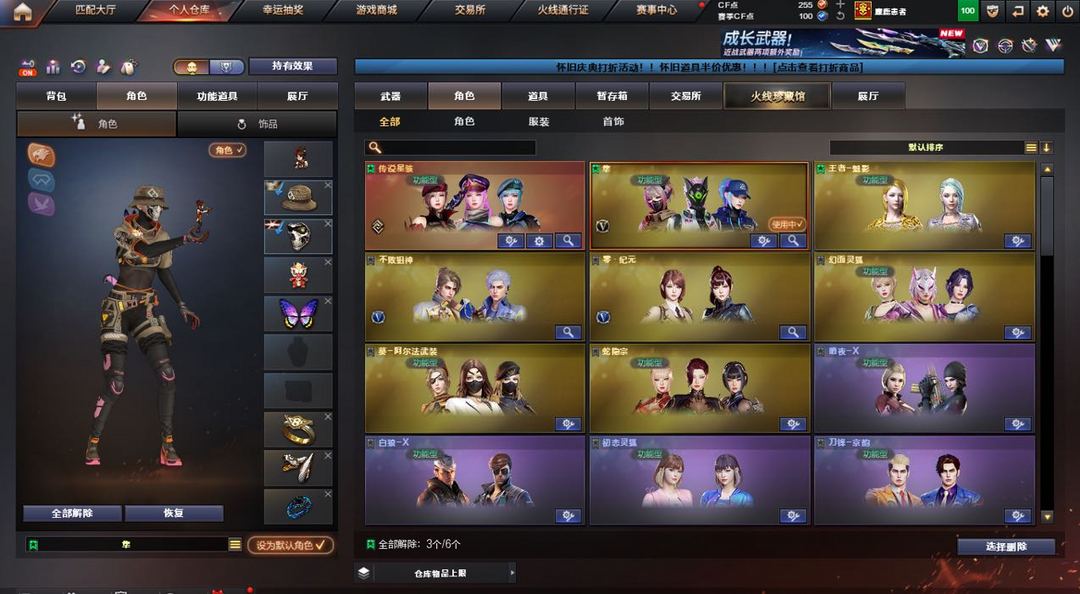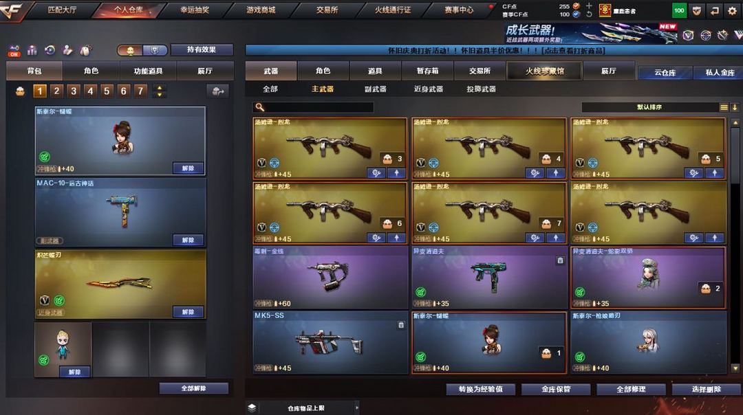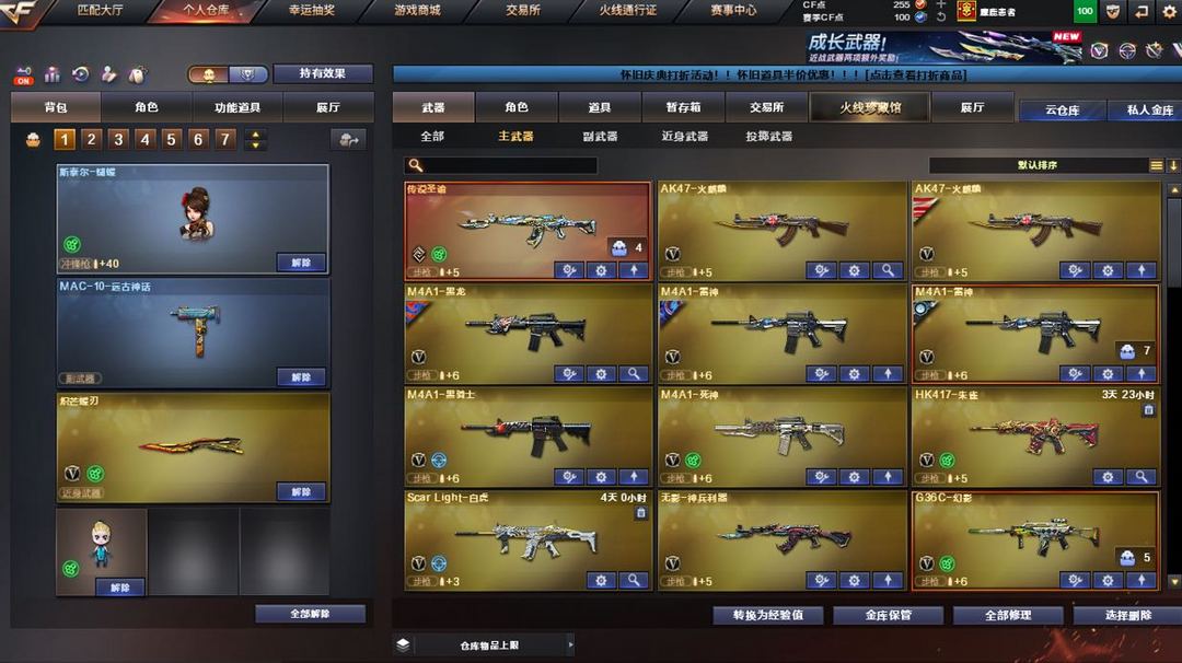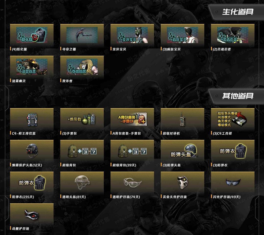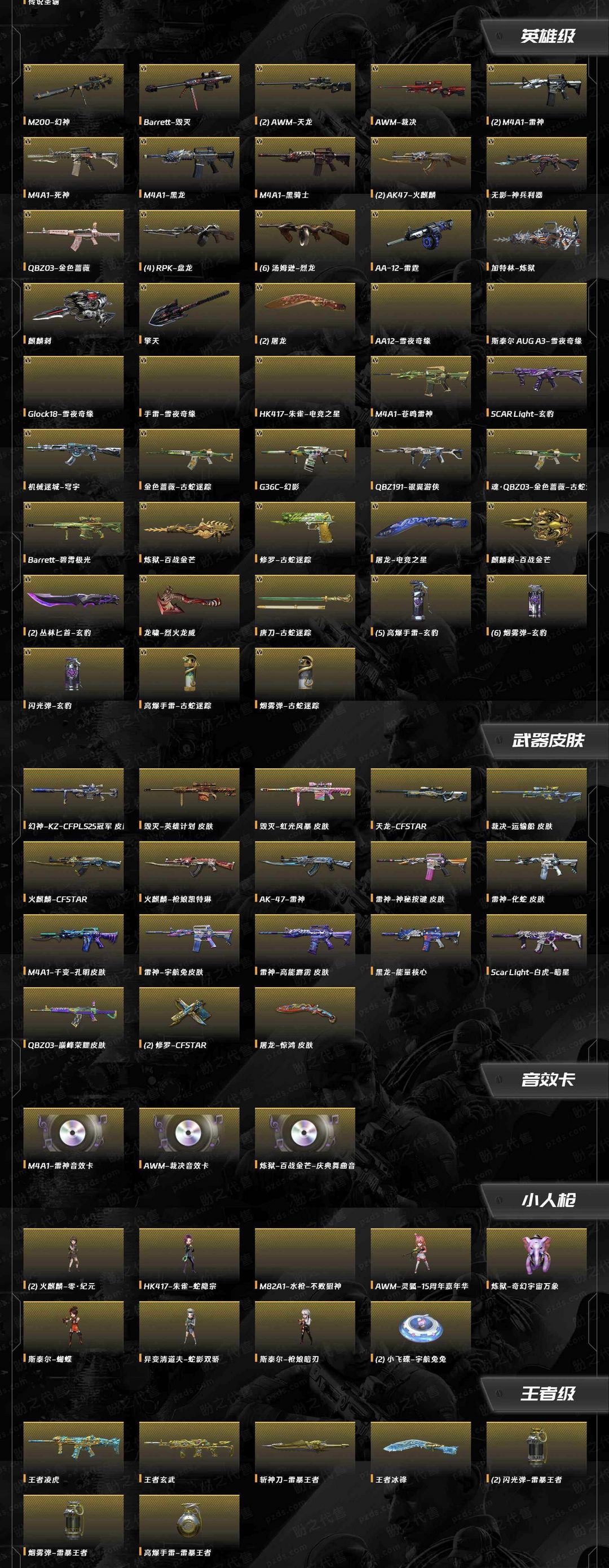 王者武器:王者冰锋;王者凌虎;王者玄武;炫金天龙 英雄武器:擎天;Barrett-碧霄极光;Barrett-毁灭;汤姆逊-烈龙;高爆手雷-玄豹;烟雾弹-玄豹;闪光弹-玄豹;丛林匕首-玄豹;SCAR Light-玄豹;机械迷城-穹宇;AA-12-雷霆;AWM-裁决;传说圣谕;龙啸-烈火龙威;RPK-盘龙;G36C-幻影;M200-幻神;AK47-火麒麟;麒麟刺;M4A1-雷神;AWM-天龙;屠龙;M4A1-黑骑士;加特林-炼狱;M4A1-死神;Barrett-毁灭;M4A1-黑龙 角色:隼;传说星骇;猎狐者;飞虎队;刀锋;潘多拉;曼陀罗;幻影;堕天使;G.E.M.邓紫棋;陈龙野-Y;娜塔莎;救世复仇;救世主;王力宏;影武者-X;王者-魅影;暗夜-X;剑齿虎-X;圣诞潘多拉-X;代号:翼;芳心审判者;兔囡囡;毒蝎-X;风暴女;精英部队-X;刀锋-京韵;铁骑 道具:生化弹匣;步枪弹匣;炫彩背包-诺拉;AWM-裁决音效卡;泉枢动力水壶;弦波科技无线电;绿色巨人;疯狂宝贝;防化服;C4工具钳;手雷包;防弹衣;防弹头盔;云山科技背包;京剧背包;智眸战术目镜;手枪弹匣;机枪弹匣;冲锋枪弹匣;听风战术