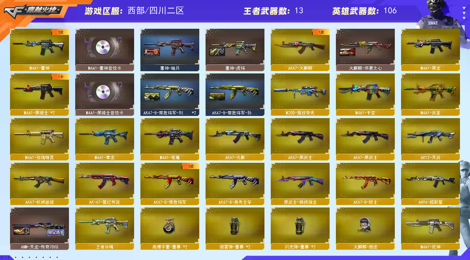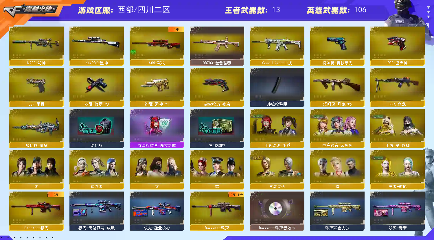 116V幻神星神竞技荣光6烈龙白虎堕天神武圣毁灭极光金色蔷薇烈火 千变 火麒麟 黑龙 黑骑士 无影 死神 黑武士 天龙 毁灭 极光 裁决 王者之光 征服者超越6 修罗 天神 usp雷暴 堕天神cop 柯尔特竞技荣光 屠龙 擎天 麒麟刺 战神刀雷暴 堕天神龙啸 麒麟刺堕天神 审判者 零 葵 樱 瞳 云悠悠;USP-雷暴,电竞教官-云悠悠,RPK-盘龙,QBZ03-金色蔷薇,M200-幻神,Scar Light-白虎,Kar98K-星神,