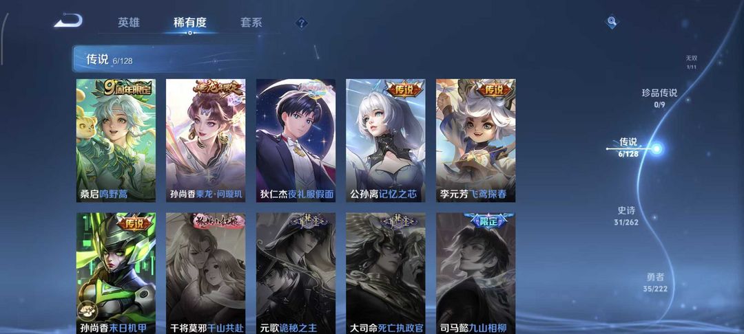 v10、12水555皮、死亡执政官、刘备星传说时之思念、小兵皮肤大耳狗甜茶、瑶无双真我赫兹、愿照·九州拓、怪盗基德、画中仙、至尊宝、凤求凰、神威、天魔缭乱