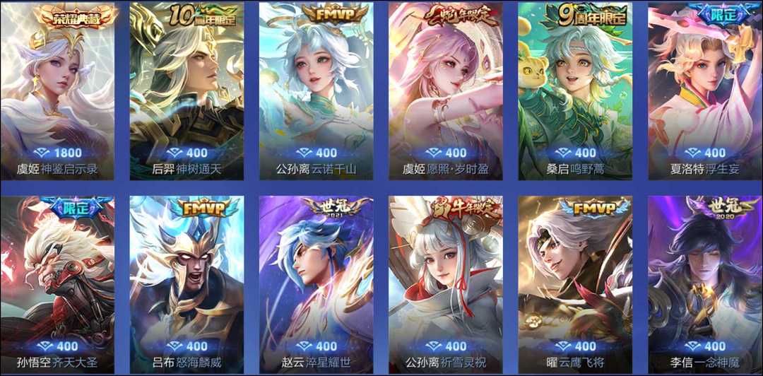 v10、12水555皮、死亡执政官、刘备星传说时之思念、小兵皮肤大耳狗甜茶、瑶无双真我赫兹、愿照·九州拓、怪盗基德、画中仙、至尊宝、凤求凰、神威、天魔缭乱