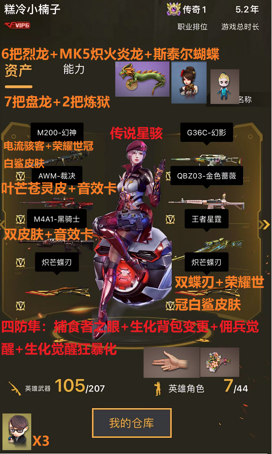 北部百V✅ 114V✅工坊6烈6盘✅蝴蝶刀➕皮肤✅隼✅斯泰尔-蝴蝶✅永久生化-伪装✅生化爆破双全装号✅ 幻神皮肤(荣耀白鲨)(电竞骇客) 蝴蝶刀➕皮肤荣耀白鲨 等等 北部战区合区大区(河北一区、辽宁一区、辽宁二区、辽宁三区、山东一区、山东二区、河南一区、河南二区、北京一区、北京二区、黑龙江一区、北方大区、北京三区、北京四区、吉林一区、山西一区)登录的时候选择河南一区。 【编号】:HN553 【角 色】:传说影煞、传说星骇、王者零华冠丽服、樱、魅影、隼(佣兵觉醒、捕食者之眼)乔伊教练、云海游龙、风暴女、救世主-X、蜀雪、铁骑荣耀、影舞者-X、8周年戒指、双蛇戒指、双龙戒指 【主 武】:幻神(电流骇客)、G36C幻影、6烈斯太尔蝴蝶、6盘炼狱(斗鱼皮肤)、裁决(裁决音效卡、叶芒苍灵)、王者星霆、夜魔、雷暴、猎神、王者之心、王者之影、王者之戮、炫金天龙X2、火麒麟(平天大圣)、黑龙X2(能量核心)、雷神X3(暗月)、黑骑士(白马银枪)、无影、死神、天启、黑鲨、龙血X2、MK5赤火炎龙、烈火动感闪耀、QB金色蔷薇、天龙(能量核心)、毁灭X3(耀金、战神)、冰龙粉碎者、机甲撕裂者、激光毁灭者、圣炎切割者、深渊巨龙咆哮、神圣爆裂者、试炼破坏者、苍雷、金魔等各种活动武器 【副 武】:USP雷暴、冥王/修罗X2(STAR)、柯尔特电竞装甲、天神动感闪耀、阐释者、COP小青龙、胜利之火、大黄蜂 【近 身】:王者之锋、雷霆王者之锋、王者之啸、炽芒蝶刃、屠龙(星火燎原)、擎天、麒麟刺、斩神刀雷暴、麒麟刺堕天神、幻灵之锋X2、丛林匕首-枪王排位、猫猫手套、激光短刃、冰火魔拳 【投 掷】:雷暴套装X4、堕天神套装、电竞装甲套装、迷你生化手雷、深渊终结者手雷、胜利之光、高爆手雷-雷蛇、高爆手雷-SS 【道 具】:黑骑士音效卡、黑龙音效卡、屠龙动感闪耀音效卡、天神动感闪耀音效卡、烈火动感闪耀音效卡、铁骑玩偶、夏日水手玩偶、关羽玩偶、7个背包、AC(防弹衣+防弹头盔)、C4工具钳、手雷包、挑战弹夹、夺命之镰、变异宝贝、灵魂忍者、生化弹夹、防化服、机枪弹夹、冲锋枪弹夹、散弹枪弹夹、手枪弹夹、狙击枪弹夹、步枪弹夹、减少停顿包;USP-雷暴,柯尔特-荣耀世冠白鲨2023,炽芒蝶刃,传说影煞,传说星骇,隼,RPK-盘龙,