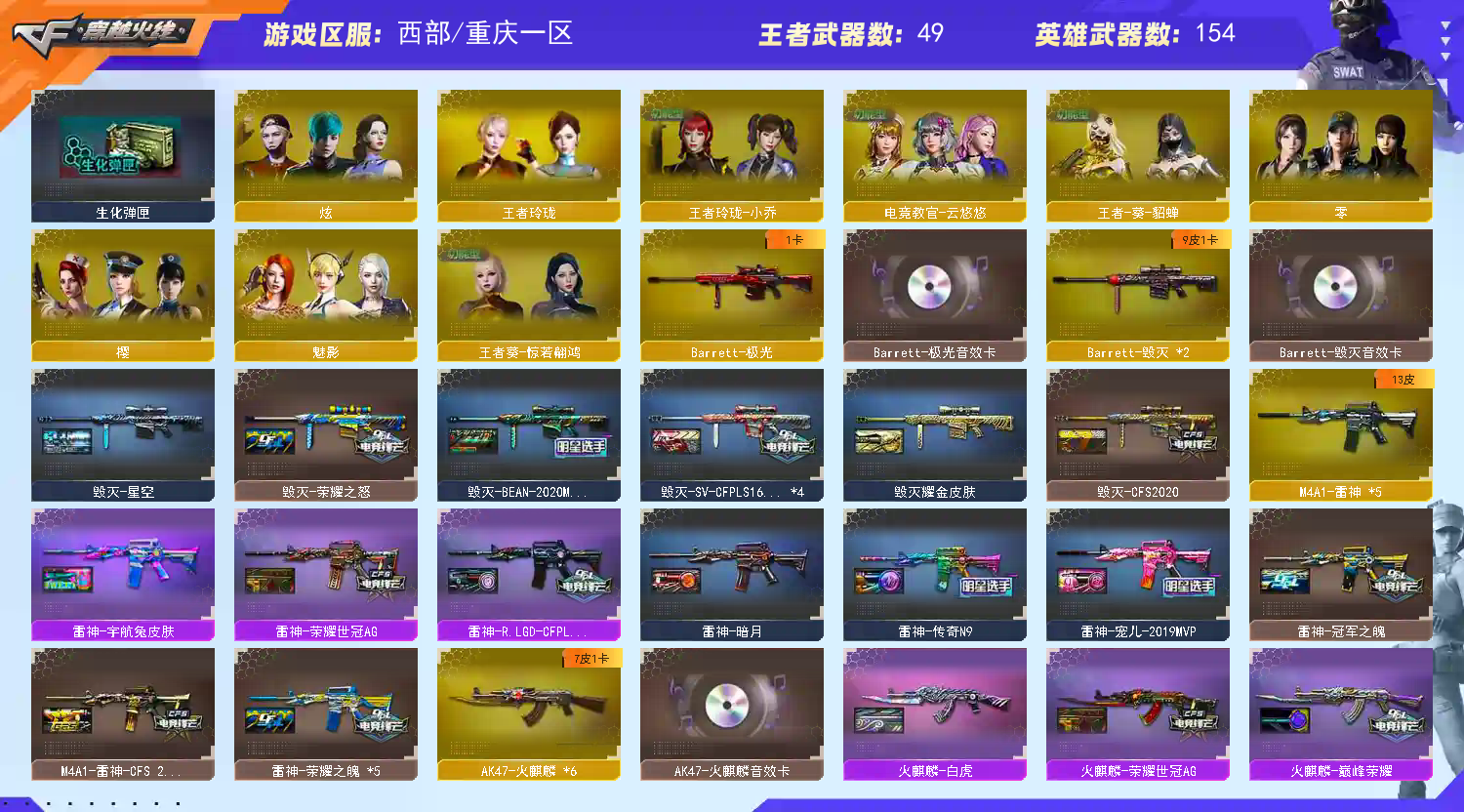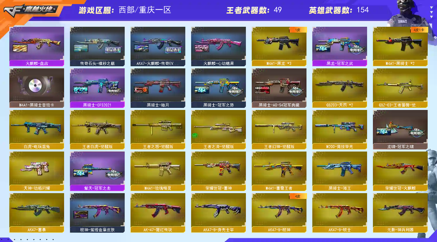 【传说女帝+m200-幻神+幻神音效卡+宠儿-2021mvp皮肤++巅峰荣耀皮肤+冠军之幻*2皮肤+cis2022皮肤+-ag-cfpls17冠军皮肤+冠军之刃】【kar98k-星神】【m200竞技荣光套装】【荣耀世冠套装】【雷暴套装】【雷霆王者套装】【6烈龙6盘龙1炼狱+斯泰尔蝴蝶】【白虎+白虎音效卡+暗星皮肤】【金色蔷薇+金色蔷薇音效卡+冠军之薇皮肤】【雷神+荣耀之魄皮肤+宠儿皮肤+冠军之魄皮肤+传奇n皮肤9】【毁灭+毁灭音效卡+荣耀之怒皮肤+sv-cfpls16冠军皮肤】【火麒麟+火麒麟音效卡+巅峰荣耀皮肤+传奇even皮肤】【黑骑士+黑骑士音效卡+冠军之势皮肤+s4冠军典藏皮肤】【黑龙+冠军之武皮肤】【极光+极光音效卡】【王者幻神 王者白虎 王者冰魄 王者火魄 王者风势 王者之心 王者之影 王者之戮 王者之势 王者之武 王者之烈 王者雷怒 王者之决 王者之力 王者之怒】【天戎】【火麒麟 黑龙 雷神 黑骑士 死神 无影神兵利器 玫瑰精灵 猎神 烈火动感闪耀 猩红传说 战士 战神 黑骑士海王 身先士卒 白虎电玩蓝兔 天龙 毁灭 极光 裁决 暗月传说 】——【热门武器/小人呛】【火麒麟灵狐 裁决雪莉杨 毁灭孙三炮 天龙曼陀罗 斯泰尔蝴蝶】【柯尔特 冠军之特/荣耀世冠-柯尔特*4/柯尔特-竞技荣光/柯尔特-赛博朋克/usp-雷暴*2/修罗*8/天神】【屠龙 擎天 龙啸 麒麟刺 尼泊尔雷霆 斩神刀雷暴 麒麟刺堕天神 马来剑夜魔 擎天竞技荣光 屠龙动感闪耀 王者之锋 王者之啸 王者之击 荣耀世冠龙啸】——【雷暴投掷套装*6】【雷霆投掷套装*3】【堕天神投掷套装】【夜魔投掷套装】【竞技荣光投掷套装*6】【雷霆王者投掷套装*2】——【角色】【4防传说女帝】【4防电竞教官云悠悠 王者葵貂蝉 王者葵翩若惊鸿 王者玲珑小乔 灵狐者职业经理】【零 炫 魅影 乔伊教练 王者玲珑 修道士】;USP-雷暴,荣耀世冠-柯尔特,柯尔特-冠军之特,Knife-冠军之刃,传说女帝,电竞教官-云悠悠,RPK-盘龙,