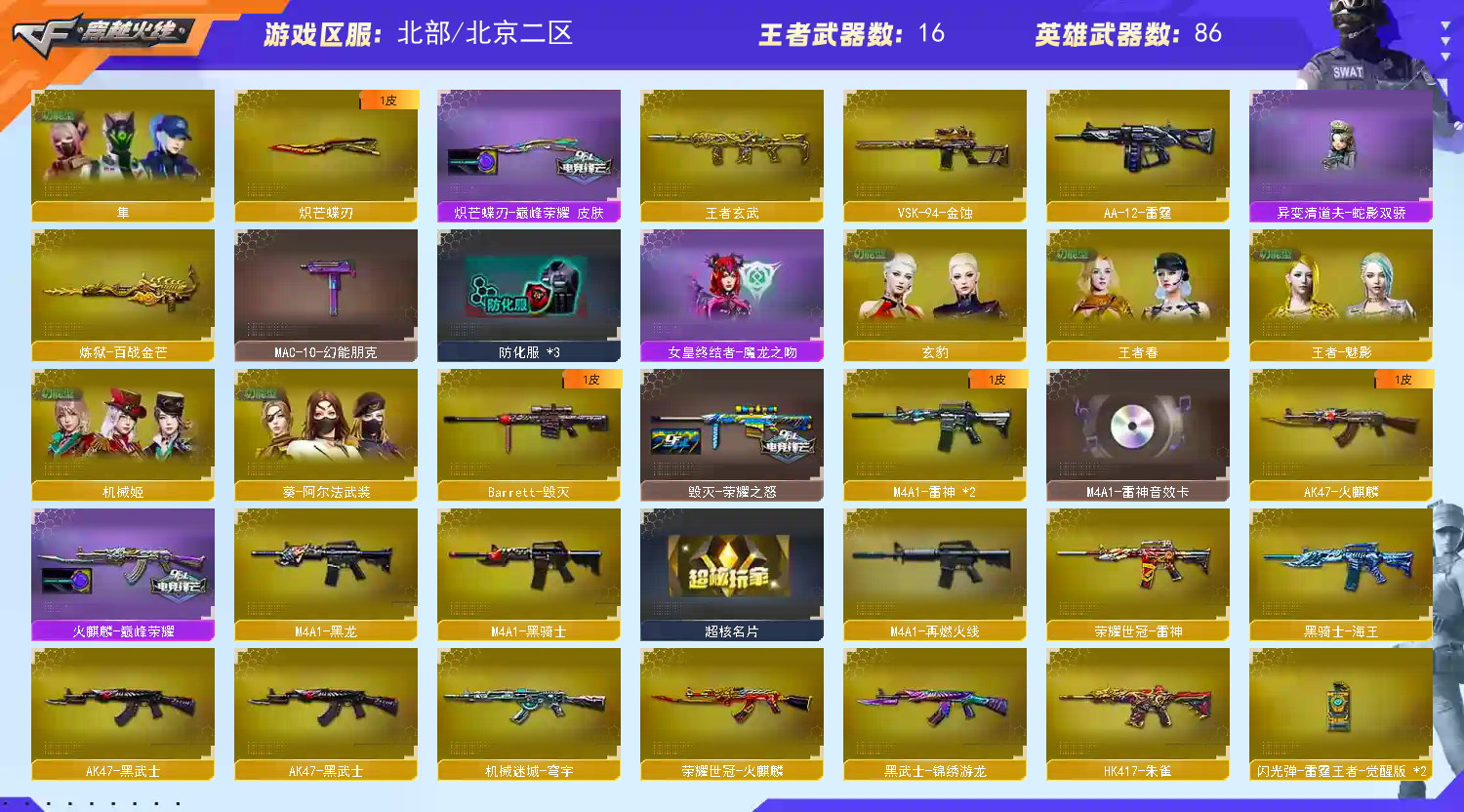 首页 > 租号大厅 > 穿越火线 > 网通区/北京二区 > 爆破天花板神威天绫+金色昵称➕星骇、手枪大满贯Ep套幻神星神幻影天绒裁决巅峰带卡(号已备案)