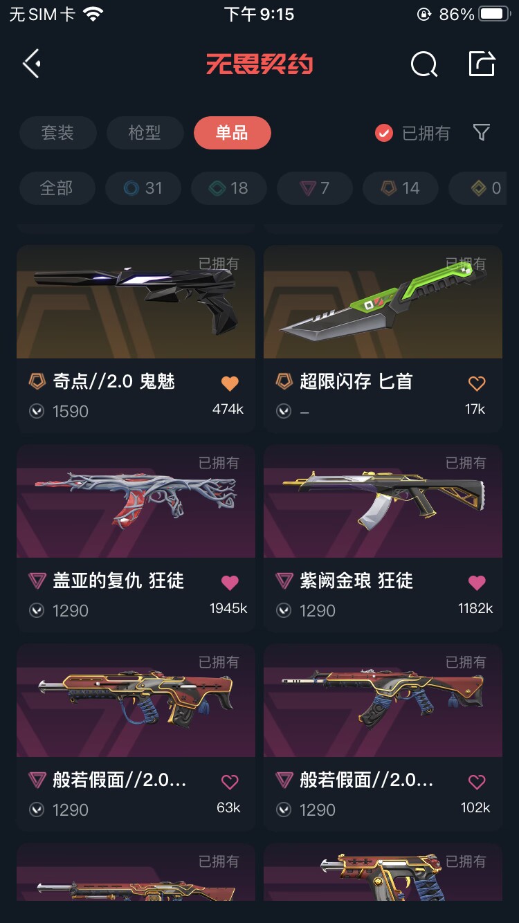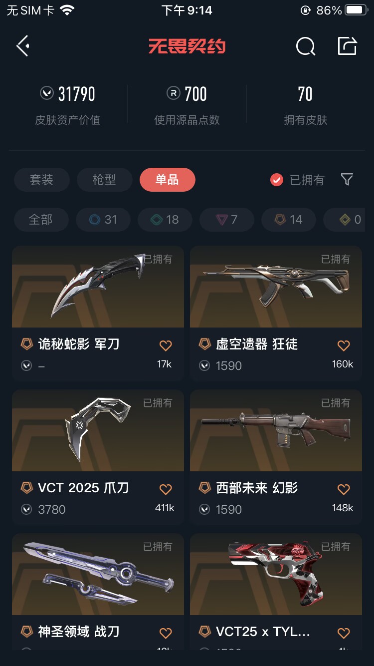等级170/人物27/武器70/奇点2.0套装 般若假面2.0套装 奇点//2.0-蝴蝶刀 鬼丸国纲 诡秘蛇影-军刀 奇点//2.0-狂徒 奇点//2.0-鬼魅 般若假面//2.0-狂徒 般若假面//2.0-獠犬 般若假面//2.0-战神 般若假面//2.0-狂怒 虚空遗器-狂徒 西部未来-幻影 紫阙金琅-狂徒 盖亚的复仇-狂徒 掠影-狂徒 诡秘蛇影-狂徒 神圣领域-獠犬 神圣领域-幻影 手工达人-幻影 荒土机兵-狂徒 超限闪存-幻影 折光棱晶-戍卫 末日之翼-幻影 月球哨兵-戍卫 纳米-幻影 逆冲蛮牛-戍卫 逆冲蛮牛-獠犬 模拟赫兹-獠犬 浮光跃金-戍卫;VCT 2025 爪刀,盖亚的复仇 狂徒,虚空遗器 狂徒,掠影 狂徒,紫阙金琅 狂徒,千灵华绽 正义,
