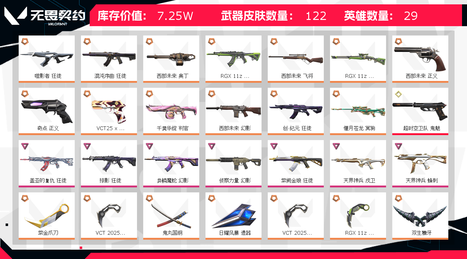 郑重声明:若出现 账号封禁/毁号等情况,本人商户多年,所属账号已在派出所备案,经过网络财产备案价值! 使用外挂脚本导致游戏账号封禁直接向平台提取ip地址!一经发现直接报警处理立案追责,根据账号价值追究其法律责任! 请租客文明游戏,不要开挂或挂机!切勿心存侥幸!因无畏契约检测严格,为防止后台插件导致封号,上号前请务必重启电脑! 注意事项:出现冻结,我们看到后会及时解冻。等5-10分钟重新登陆即可 1.登陆界面稍等2分钟会上去(自动登录)老板不要着急,一次不行多来几次wegame界面要耐心等2分钟 2.密令会自动输入如果一次不成功多来几次。 3..进入wegame后到弹短信验证处,关闭掉,重新下载无畏契约这个游戏即可成功上号,记住。这个方法百分百上号成功!就是进入wegame重新下载无畏契约游戏 !!!百分百成功!! 4.请及时续租不要挂机,到时不下线,但是下一个会挤号导致挂机,所以请及时续租,导致禁赛的一律拉黑 。 5.祝老板玩的愉快,喜欢可以收藏关注;西部未来 奥丁,紫金爪刀,VCT 2025 爪刀,盖亚的复仇 狂徒,噬影者 狂徒,掠影 狂徒,异鳞魔蛇 幻影,