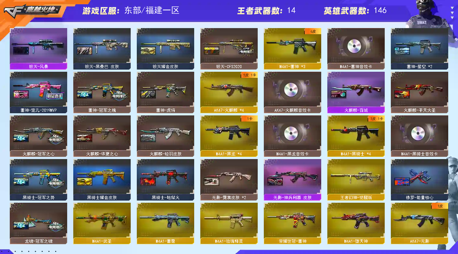 >>>>>>毁号,涉及毁坏虚拟财产罪及计算机安全罪,请文明游戏素质游戏,让我们共建美好租号平台>>>>>> 东部福建一区幻神➕星神王者幻神➕白虎世冠雷神6烈龙➕雷暴套堕天神套雷霆套斯泰尔蝴蝶死亡之眼全音效卡➕火麒麟冠军之心华夏之心➕雷神宠儿白鲨冠军冠军之魄➕黑骑士冠军之势➕可排位 注意事项: A.游戏过程中请不要恶意挂机或者不文明发言 B.恶意挂机、顶号等行为将被拉黑无法再次下单 C.进入游戏后中途请勿退出登陆,否则无法再次上号 D.部分账号由于异地登录可能会出现密码错误提示,通常再尝试5-6次后可上号 |||||||||喜欢本账号请点 ☆收藏☆;USP-雷暴,荣耀世冠-柯尔特,RPK-盘龙,QBZ03-金色蔷薇,M200-幻神,Scar Light-白虎,Kar98K-星神,