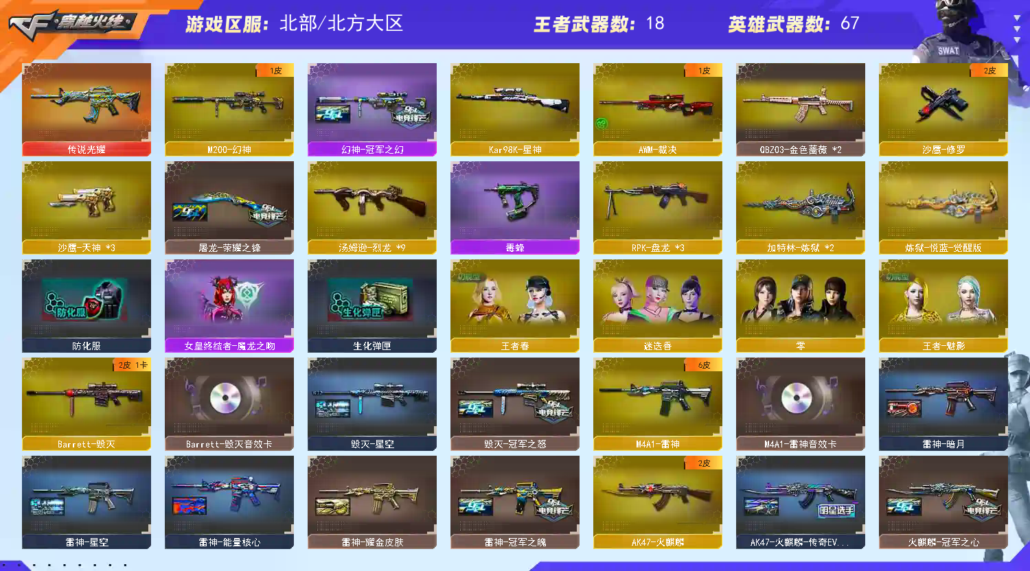 >>>>>>毁号,涉及毁坏虚拟财产罪及计算机安全罪,请文明游戏素质游戏,让我们共建美好租号平台>>>>>> 北部北方大区【幻神冠军之幻➕星神】光耀朱雀世冠套王者魅影王者春毁灭sv火麒麟传奇EVEN冠军之怒魄心势啸锋可排位 装备不多,但是主武器、副武器、近身武器够用 拥有完美游戏体验。重要的是,特殊装备有:AK47-火麒麟、麒麟刺、荣耀世冠-雷神、荣耀世冠-火麒麟、M4A1-玫瑰精灵、加特林-炼狱、HK417-朱雀、传说光耀、M200-幻神、王者之心、炼狱-悦蓝-觉醒版、炼狱-悦蓝、炫金武士、王者之光、炫金天龙、王者幻神、玫瑰精灵-悦动、王者之戮-觉醒版、王者之魄-觉醒版、火麒麟-暗月、迷迭香、王者-魅影、职业选手、堕天使、王者之心金色光效、生化弹匣、炼狱-悦蓝金色光效、等,随意畅选。 注意事项: A.游戏过程中请不要恶意挂机或者不文明发言 B.恶意挂机、顶号等行为将被拉黑无法再次下单 C.进入游戏后中途请勿退出登陆,否则无法再次上号 D.部分账号由于异地登录可能会出现密码错误提示,通常再尝试5-6次后可上号喜欢本账号请点 ☆收藏☆ 方便下次租用,谢谢光临惠顾;RPK-盘龙,QBZ03-金色蔷薇,M200-幻神,Kar98K-星神,