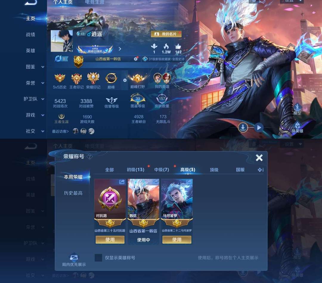 立即租号首页 > 租号大厅 > 王者荣耀 > 标题写明区服/QQ > 【V7 155皮】2月在榜1.1w省标韩信/马可波罗❤️历史小国标韩信/曜❤️可排禁巅峰❤️弑枪猎影