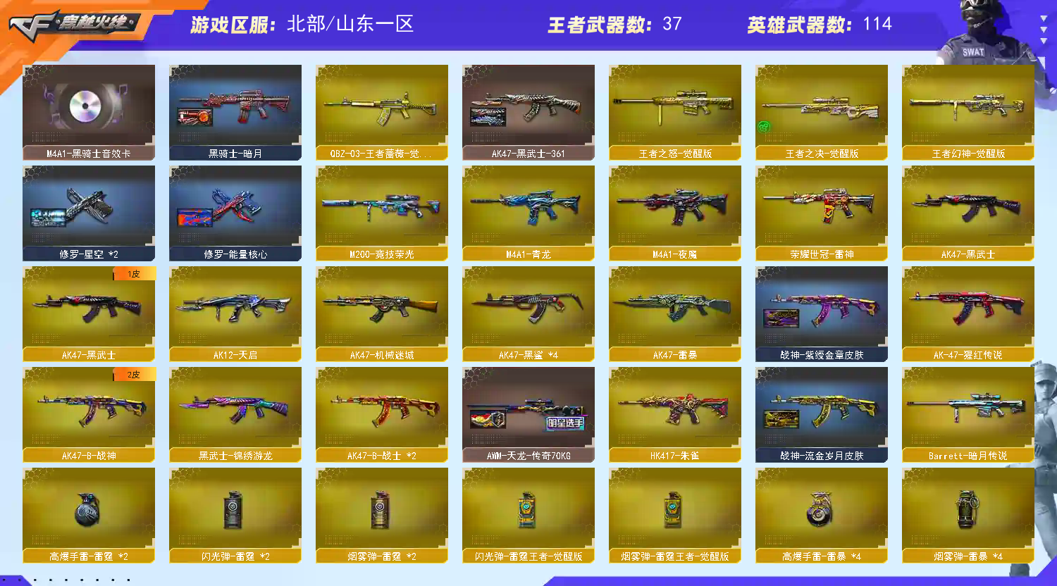 ★收藏好评! 由于异地登录保护机制,部分客户在使用客户端自动上号时会出现密码错误,注意本号密码不会错误,请多尝试5-6次!本账号已经过虚拟财产认定,请各位科技大神高抬贵手。请素质租号,文明游戏,谢谢大家配合!!;USP-雷暴,荣耀世冠-柯尔特,传说女帝,电竞教官-云悠悠,QBZ03-金色蔷薇,M200-幻神,Kar98K-星神,