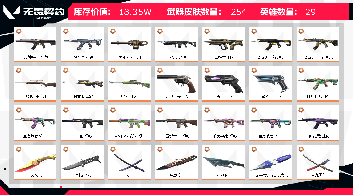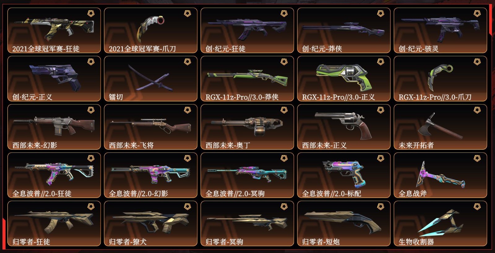【拥有套装】西部未来套装(西部未来-幻影,西部未来-奥丁,西部未来-飞将,西部未来-正义,未来开拓者)创纪元套装(创·纪元-狂徒,创·纪元-莽侠,创·纪元-骇灵,创·纪元-正义,镭切)全息波普2.0套装(全息波普//2.0-狂徒,全息波普//2.0-幻影,全息波普//2.0-冥驹,全息波普//2.0-标配,全息战斧)2021全球冠军赛套装(2021全球冠军赛-狂徒,2021全球冠军赛-爪刀)RGX-11z-Pro//3.0套装(RGX-11z-Pro//3.0-莽侠,RGX-11z-Pro//3.0-正义,RGX-11z-Pro//3.0-爪刀)归零者套装(归零者-獠犬,归零者-狂徒,归零者-冥驹,归零者-短炮,生物收割器)天界神兵套装(天界神兵-戍卫,天界神兵-飞将,天界神兵-蜂刺,天界神兵-鬼魅,天玄刀)异形猎人套装(异形猎人-幻影,异形猎人-奥丁,异形猎人-雄鹿,异形猎人-狂怒,剥皮小刀)侦察力量套装(侦察力量-戍卫,侦察力量-幻影,侦察力量-骇灵,侦察力量-鬼魅,侦察力量-蝴蝶刀)