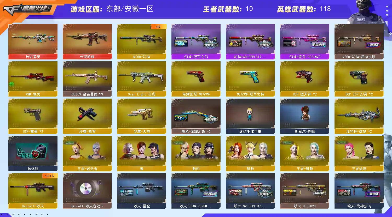 双传说圣灵暗裔🔥幻神4皮🔥白虎QBZ金色蔷薇🔥8副手🔥冠军全皮;USP-雷暴,荣耀世冠-柯尔特,柯尔特-冠军之特,QBZ03-金色蔷薇,M200-幻神,Scar Light-白虎,传说暗裔,