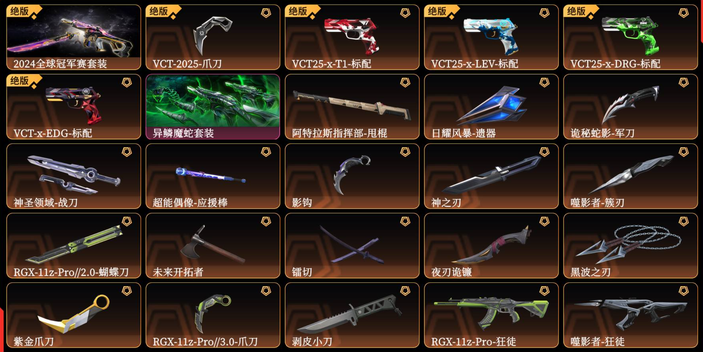 19刀皮★97枪皮★2024冠军套★异鳞魔蛇套★剥皮小刀★紫金爪刀★黑波之刃★VCT2025爪刀