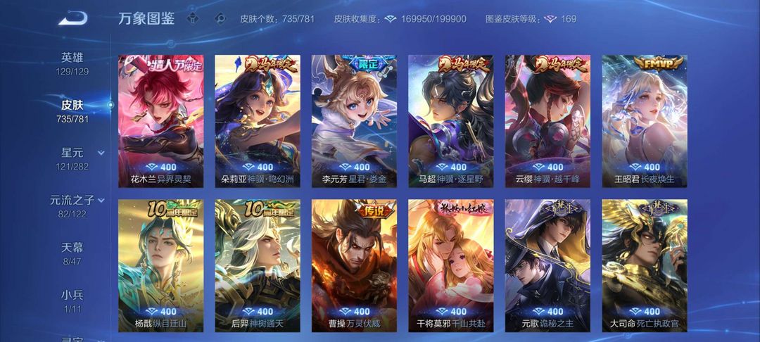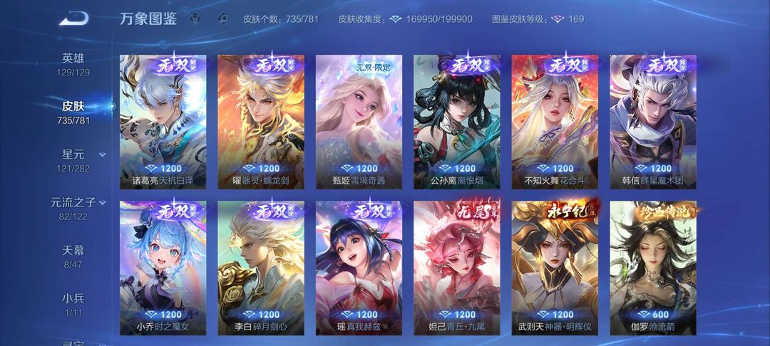v10、537皮6水4无双、安琪拉-颠倒童话·魔镜、朵莉亚-神骥、遇见神鼓、齐天大圣、白虎志、韩信荣耀典藏、73传说、时之魔女、瑶无双、青丘、九尾、神器明辉仪