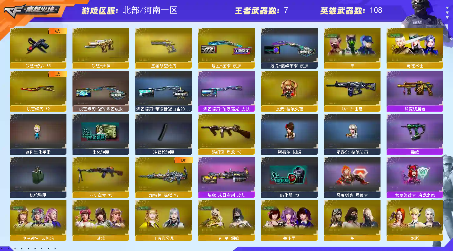 !!!!!!!!!!!!!!!!!!!! 租客必看: 【禁止使用鼠标宏,DMA,外挂进行游戏,造成损失后果自负!!!】 【订单时间快到了禁止再开排位赛,导致账号禁赛的租客将被永久拉黑!】 !!!!!!!!!!!!!!!!!!!! ① 北部 【爆破天花板 生化全装】号: ✅爆破: ✨传说武器 豹子序列号9999 | 传说幽瞳 | 传说辉光*2 | 传说夜影 | 传说幽冥*2 ✨英雄级角色 4防云悠悠 | 4防晴雅 | 4防王者葵貂蝉 | 4王者魅影 | 4防岚兮儿 | 4防毒蝰术士 | 隼 | 关小雨 | 枪娘樱 ✨幻神6皮带卡 | 幻神-传说欧欧 | 幻神-星火小队臻藏签名版 | 幻神-荣耀世冠白鲨2023 | 幻神-荣耀世冠白鲨 | 幻神-HeartShot女团 | 幻神-电流骇客 | 幻神音效卡 | M200-竞技荣光 | 幻神-枪娘爱丽丝 ✨星神3皮卡 | 星神-巅峰荣耀 | 星神-傲竹金蛇 | 星神-枪娘默 | 星神音效卡 | 王者星神 ✨裁决-流光秘银 | 王者之光 | 王者星光 ✨毁灭6皮卡 | 毁灭-HeartShot女团 | 毁灭-荣耀之怒 | 毁灭音效卡 ✨G36C-幻影 | QBZ191-银翼 ✨QBZ03金色蔷薇 | QBZ03-传奇宠儿 | QBZ03-荣耀世冠白鲨 | 金色蔷薇-破浪逐光 | 金色蔷薇音效卡 ✨Scar Light白虎 | 白虎-电玩粉兔 | Scar Light-马枪 ✨雷神 | 雷神-荣耀之魄 | 雷神-传奇N9 | 雷神音效卡 ✨火麒麟-传奇EVEN | 火麒麟-HeartShot | 火麒麟音效卡 ✨天花板副武器: 1)COP*1 = COP-雲龙 2)柯尔特*9 = 冠军之特*2 | 柯尔特-荣耀世冠白鲨2023*4 | 柯尔特-竞技荣光*3 3)USP*1 = USP雷暴 4)王者破空枪刃 5)传说幽冥*2 ✨冠军之刃*3 ✨黄金猫猫手套-白鲨*2 ✅生化: ✨生化标记人物--4防毒蝰术士 | 隼 ✨生化近战武器--炽芒蝶刃*2 | 炽芒蝶刃-荣耀世冠白鲨2023 | 炽芒蝶刃-破浪逐光 | 炽芒蝶刃-冠军炽芒 ✨生化冲锋枪--斯泰尔-枪娘暗刃 | 斯泰尔-蝴蝶 | 毒蜂 | MK5-炽火炎龙 | 烈龙*6 ✨生化机枪--炼狱-末日审判 | 炼狱*2 | 盘龙*5 ✨生化道具--迷你生化手雷 | 满弹匣 | 机械猎手-幻灵猎姬 ② 有什么问题请填写真实理由【不要无故撤单】否则拉黑,本店将拉黑【恶意撤单/排位离线】的不文明租客;
