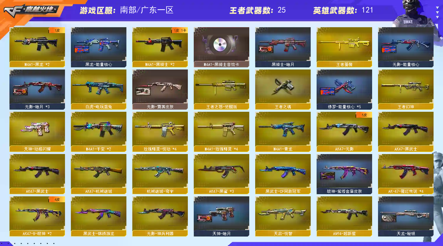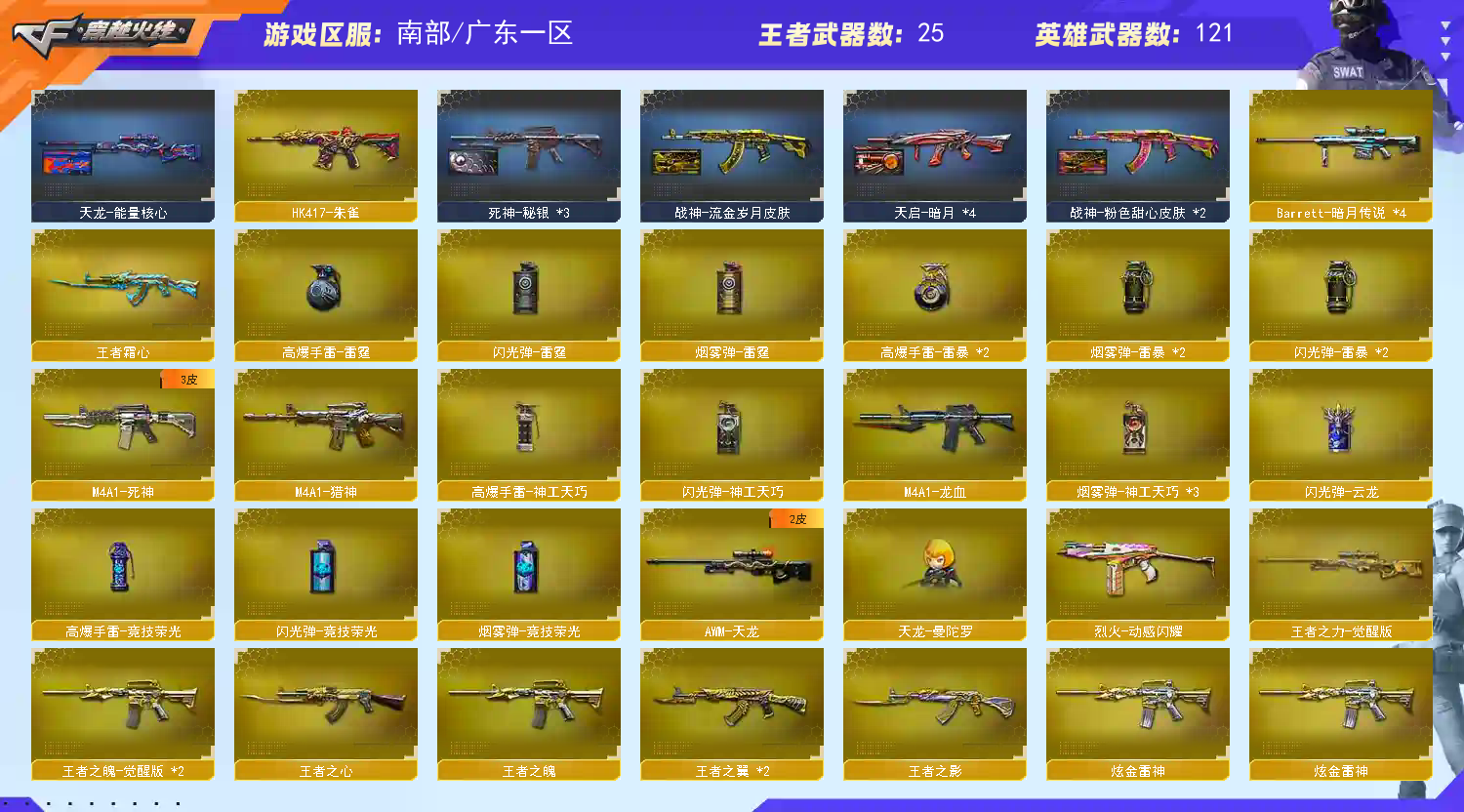 【GD214】106V30王者炫金 【昵称】織芜ぞ元嬰よ 广东电信一区(南部战区) 【角色】葵、迷迭香、樱、狐影、王者-零、零-水下丽影、堕天使、复仇者、幻影、锋、VIP6 【主武】王者幻神、王者之翼、王者之力、王者之势、王者之怒、王者之影、炫金超新星X4、炫金骑士、炫金雷神、炫金毁灭X2、炫金武士、王者之魄X2、王者之城、M4A1-千变X3、AK47-火麒X2、AK47-麒麟、M4A1-黑龙X2、M4A1-雷神X3、M4A1-黑骑士X2、AK47-无影、M4A1-死神、AK47-黑武士X2、AN94-超新星、M4A1-武圣X2、AK47-机械迷城、AK47-黑鲨X3、M4A1-龙血、M4A1-青龙、M4A1-玫瑰精灵X4、QBZ03-金色蔷薇、M4A1-猎神、AK-47-猩红传说、黑武士-CF网剧冠军、AWM-天龙、Barrett-毁灭X5、Barrett-极光X4、AWM-裁决、RPK-盘龙X6、加特林-炼狱X6、炼狱-悦蓝、汤姆逊-烈龙X6、AA-12-雷霆X2、死亡之眼、玫瑰精灵-悦动X4、天启-悦智、斯泰尔-恶棍、M37-葵、9A91-赤血龙魂、C.A.T、M4A1-雷神-刀锋、 【副武】王者之魂、沙鹰-修罗X5、沙鹰-天神X3、Glock18-武圣、天神-CF网剧冠军、COP-旗袍、Cop357-迷彩 【近身】王者之锋、王者之刺、擎天-CF网剧冠军、屠龙X4、龙啸X3、擎天X3、麒麟刺X4、雷霆之锋、斩神刀-雷暴、斩神刀、水晶宝珠、轻型军用手斧-镜、黄金生化钩 【投掷】高爆手雷-雷霆、高爆手雷-雷暴X2、闪光弹-雷霆、闪光弹-雷暴X2、烟雾弹-雷霆、烟雾弹-雷暴X2、手雷-CFS2017纪念版、闪光弹-CFS2017纪念版、凤舞云烟X2 【道具】炫彩背包、闪光护目镜 3922天、烟雾保护头盔 2365天16小时、防弹衣、防弹头盔、手雷包 、C4工具钳、手枪弹匣 109天13小时、步枪弹匣6649天22小时、金蛇戒、银蛇戒、变相怪杰 【皮肤】屠龙-荣耀之锋、火麒麟-CFSTAR、毁灭-星空、雷神-星空、无影-能量核心、黑龙-能量核心、天龙-能量核心、雷神-能量核心、修罗-能量核心、极光-能量核心、天龙-秘银、死神-秘银X3、天启-暗月、黑骑士-暗月、天神-暗月、无影-暗月X2、黑龙-暗月 【音效】火麒麟音效卡、毁灭音效卡、 【生化】生化弹匣、机枪弹匣278天、冲锋枪弹匣109天23小时、变异宝贝、 【光效】王者之魄金色光效X2、王者之锋金色光效、王者之心金色光效、王者之怒金色光效、盘龙蓝色光效、极光蓝粉光效、武圣紫橙光效、王者之力、极光红绿光效、黑龙红绿绿色光效、王者之锋金色光效、王者之怒金色光效、悦蓝金色光效、炼狱红绿光效、黑骑士红绿光效、天启红绿光效、 【玩偶】妖姬玩偶、深渊红龙玩偶、暴躁猪猪玩偶、小兔姬玩偶X2、王胖子玩偶、暴躁猪猪玩偶、 【战场】电击兵、爆破兵X2、猎弩兵、医疗兵X2、突击兵、重甲兵、火箭兵、战旗兵、谍报兵、坚盾兵 【挑战】神圣爆裂者III、巨龙咆哮Ⅲ、激光毁灭者III、激光毁灭者I、征服者、乱世、M240B-苍雷 【更新日期】2021/5/23 【英雄武器】:106 【王者炫金】:30 【南部战区】广东一区、广东二区、广东三区、广东四区、广西一区、江西一区、南方大区、湖南一区、湖南二区、湖北一区、湖北二区、广东电信一区、广东电信二区、广东电信三区、广东电信四区、广西电信一区、江西电信一区、南方电信大区、湖南电信一区、湖南电信二区、湖北电信一区、湖北电信二区(CF相同战区进入相同频道可以一起玩);RPK-盘龙,QBZ03-金色蔷薇,