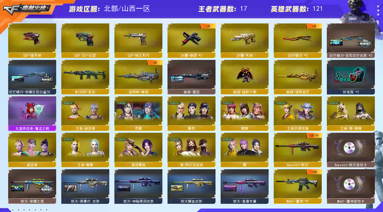 首页 > 租号大厅 > 穿越火线 > 网通区/山西一区 > 【北部】传说艾莉莎⭐幻神AGs24欧欧星火新老白鲨7皮+音⭐星神套⭐白虎白鲨QBZ柯基