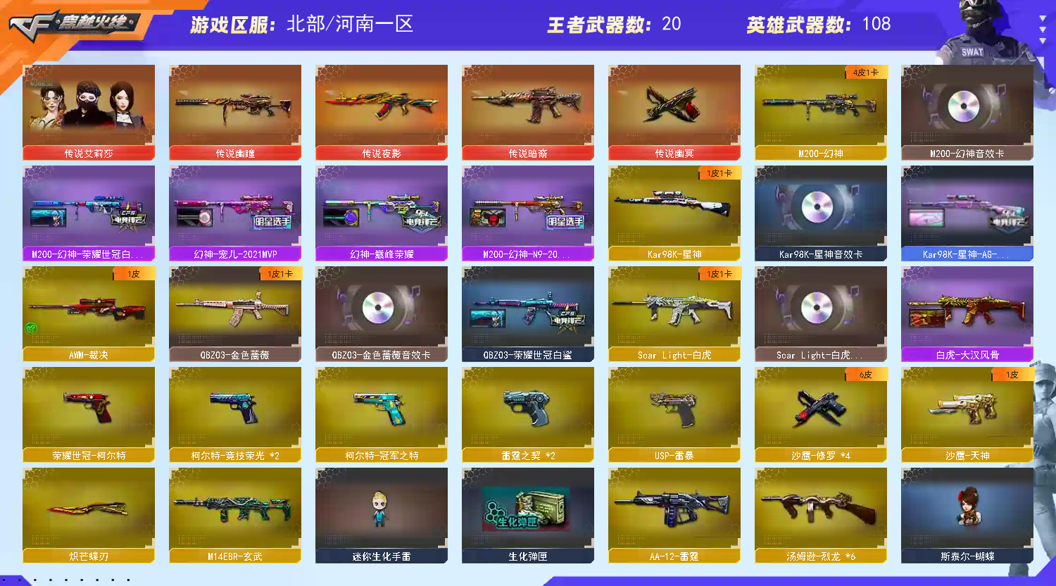 戏,让我们共建美好租号平台>>>>>> 本游戏账号:英雄武器42个; 王者武器6个。 装备不多,但是主武器、副武器、近身武器够用 拥有完美游戏体验。重要的是,特殊装备有:M4A1-黑龙、M4A1-雷神、AN94-超新星、M4A1-玫瑰精灵、QBZ03-金色蔷薇、Scar Light-白虎、Barrett-朱雀、Barrett-毁灭、M4A1-黑骑士、传说光耀、AA-12-雷霆、AK47-火麒麟、加特林-炼狱、M200-幻神、麒麟刺、王者风势、高爆手雷-雷霆王者、M4A1-雷霆王者、王者之魂、王者之武-觉醒版、王者-瞳-闭月羞花、生化弹匣、M4A1-黑龙音效卡、Barrett-极光音效卡、炼狱-悦蓝金色光效、M4A1-雷神音效卡、AK47-火麒麟音效卡、等,随意畅选。 注意事项: A.游戏过程中请不要恶意挂机或者不文明发言 B.恶意挂机、顶号等行为将被拉黑无法再次下单 C.进入游戏后中途请勿退出登陆,否则无法再次上号 D.部分账号由于异地登录可能会出现密码错误提示,通常再尝试5-6次后可上;USP-雷暴,荣耀世冠-柯尔特,传说幽冥,柯尔特-冠军之特,炽芒蝶刃,电竞教官-云悠悠,晴雅,