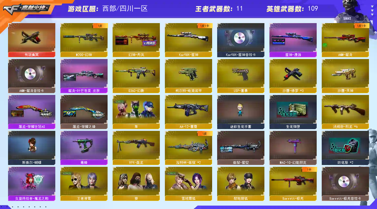 ★收藏好评! 由于异地登录保护机制,部分客户在使用客户端自动上号时会出现密码错误,注意本号密码不会错误,请多尝试5-6次!本账号已经过虚拟财产认定,请各位科技大神高抬贵手。请素质租号,文明游戏,谢谢大家配合!!;USP-雷暴,传说幽冥,隼,RPK-盘龙,G36C-幻影,M200-幻神,Kar98K-星神,