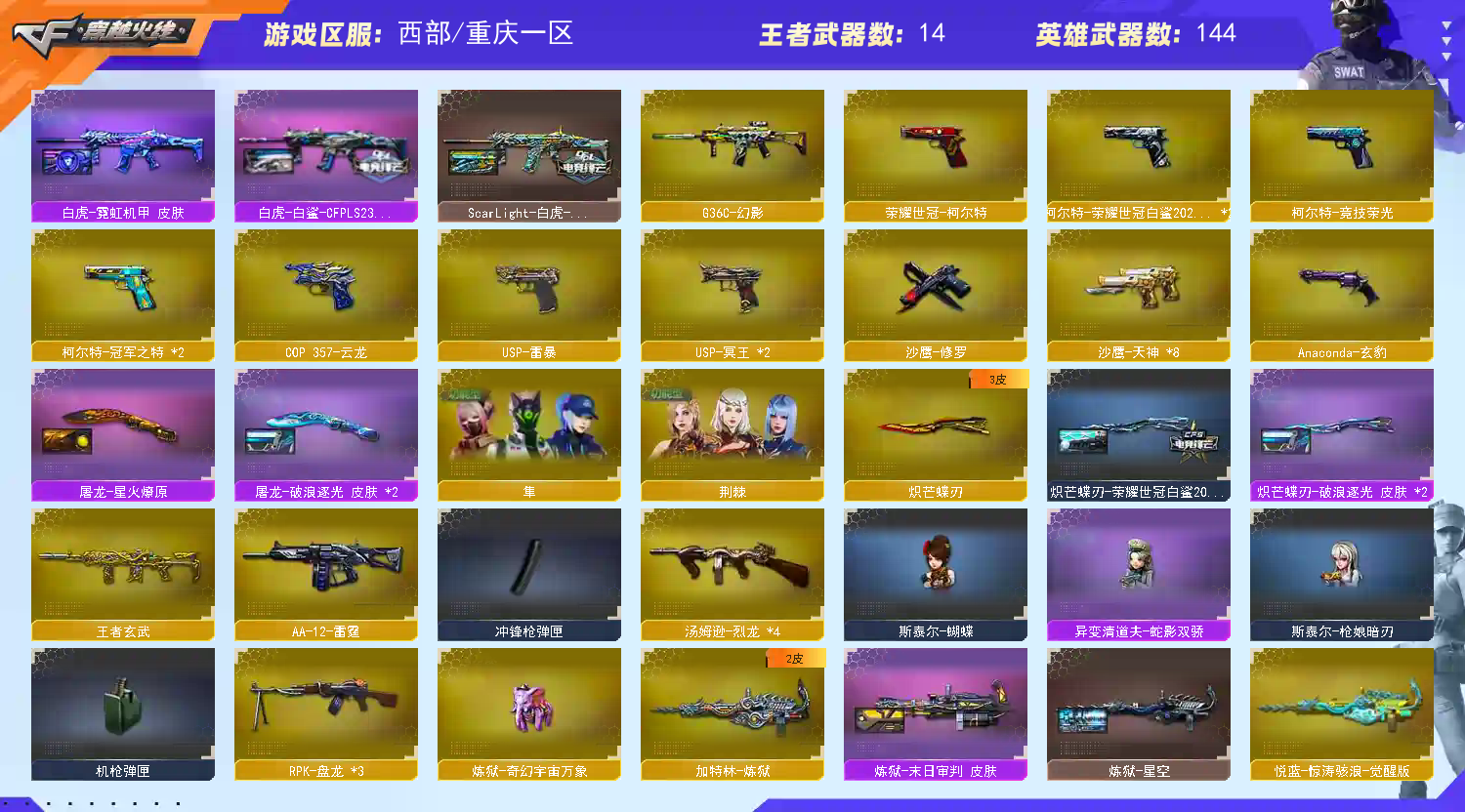【温馨提示】此号价值数万元,如有开G开辅助封号的,由平台提供,身份信息,证据和地址进行报警处理并依法追究责任!祝各位老板玩得开心。请使用官方启动,更快捷稳定上号。恶意下单维权及检测到外挂将无法再次下单!【温馨提示】排位比赛请勿中途退出游戏,一经发现拉黑处理。【温馨提示】如租号时长不足,请勿再开启排位或及时续租,避免禁排,如发现时长不足恶意开启排位,拉黑处理。;USP-雷暴,荣耀世冠-柯尔特,柯尔特-荣耀世冠白鲨2023,柯尔特-冠军之特,炽芒蝶刃,传说影煞,隼,