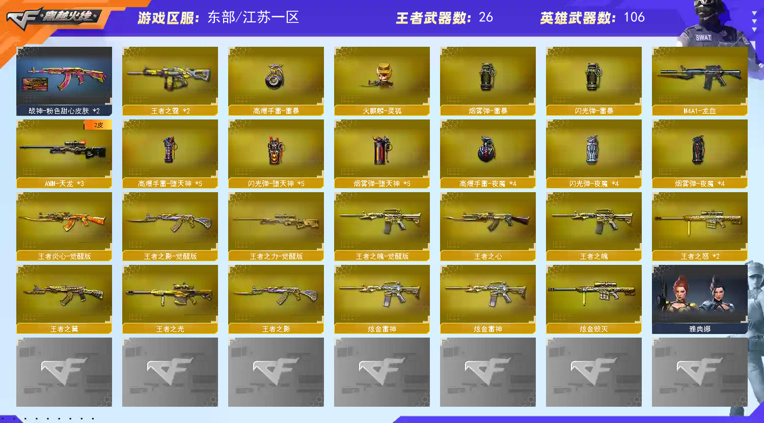 穿越火线6盘龙6列龙,传说光耀一把,传说圣灵1把,有普通幻神和王者幻神,98K星神1把,其余王者武器基本齐全,音效卡基本齐全,有王者角色,毁灭黑骑士雷神等皮肤主流的都有;RPK-盘龙,QBZ03-金色蔷薇,M200-幻神,Kar98K-星神,
