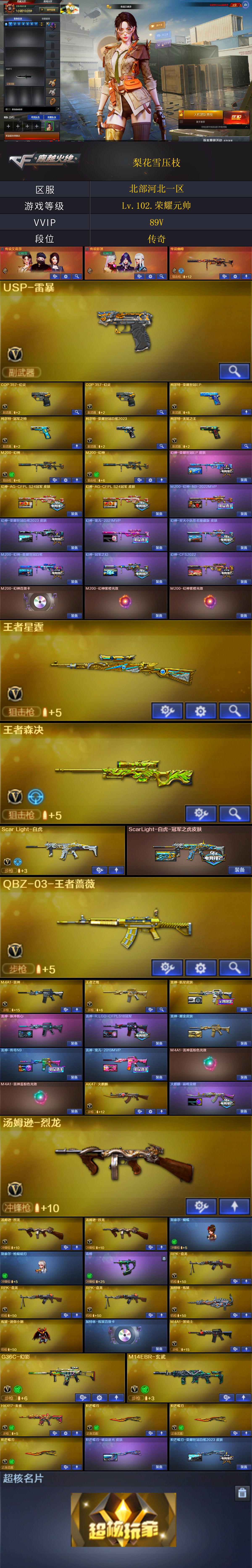 【商品标题】:北部河北一区-89V-可二次实名-【Lv.102.荣耀元帅】-【段位:传奇】 【稀有武器】:传说幽瞳/M200-幻神(2)/G36C-幻影/ScarLight-白虎/M14EBR-玄武/HK417-朱雀/USP-雷暴/COP357-幻灵(2)/修罗-云海游龙/柯尔特-荣耀世冠白鲨2023/柯尔特-无冕之王/修罗-古蛇迷踪/柯尔特-冠军之特/金色蔷薇-古蛇迷踪/AK47-火麒麟/M4A1-雷神/M4A1-黑骑士/Barrett-毁灭/RPK-盘龙(3)/加特林-炼狱/悦蓝-惊涛骇浪-觉醒版/汤姆逊-烈龙(3)/炽芒蝶刃(3)/斩神刀-雷暴/幻灵之锋 【王者武器】:王者之魄-觉醒版/QBZ-03-王者蔷薇-觉醒版/王者森决-觉醒版/王者星霆 【热门角色】:传说艾莉莎/传说影煞/鹰/隼/蛇隐宗/王者春/王者潘多拉/新海豹突击队/潘多拉-X/幽 【热门音效卡】:M200-幻神音效卡/HK417-朱雀音效卡/加特林-炼狱音效卡/Barrett-毁灭音效卡/M4A1-黑骑士音效卡 【热门皮肤】:幻神-AG-CFPLS24冠军皮肤(2)/M200-幻神-N9-2022MVP/幻神-荣耀世冠白鲨2023皮肤/幻神-宠儿-2021MVP/幻神-星火小队签名臻藏版皮肤/M200-幻神-荣耀世冠白鲨/幻神-冠军之幻/幻神-CFS2022/幻影-破浪逐光皮肤/龙啸-巅峰荣耀皮肤/雷神-R.LGD-CFPLS18冠军/炼狱-夏佐皮肤/火麒麟-巅峰荣耀/炽芒蝶刃-破浪逐光皮肤/雷神-宠儿-2019MVP/雷神-传奇N9/炽芒蝶刃-荣耀世冠白鲨2023皮肤/ScarLight-白虎-冠军之虎皮肤/毁灭-冠军之怒/黑骑士-AG-S4冠军典藏 【其他亮点】:斯泰尔-蝴蝶/炼狱-迷你小钢/毒蜂/斯泰尔-枪娘暗刃/贝雷塔687-射手座/烟雾弹-荣耀世冠白鲨2023/超核名片 (截图展示段位不代表实际段位,如赛季更新等不可抗拒因素发生变化,其余道具看截图或咨询客服);