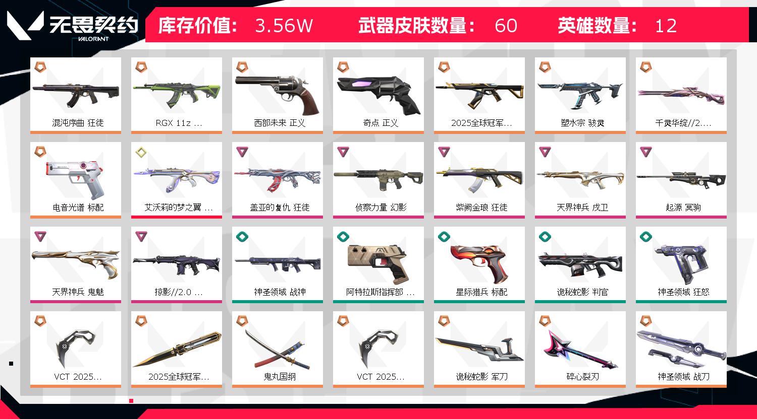 狂徒有26冠军、小猫、混沌、盖亚和紫金,幻影有侦查和掠影,刀有vct和武士刀,正义是西部和奇点,鬼魅是天界,莽侠是莲花,大狙是起源。剩下的都是通行证的皮肤。对了,别炸那么狠,要被封的。;
