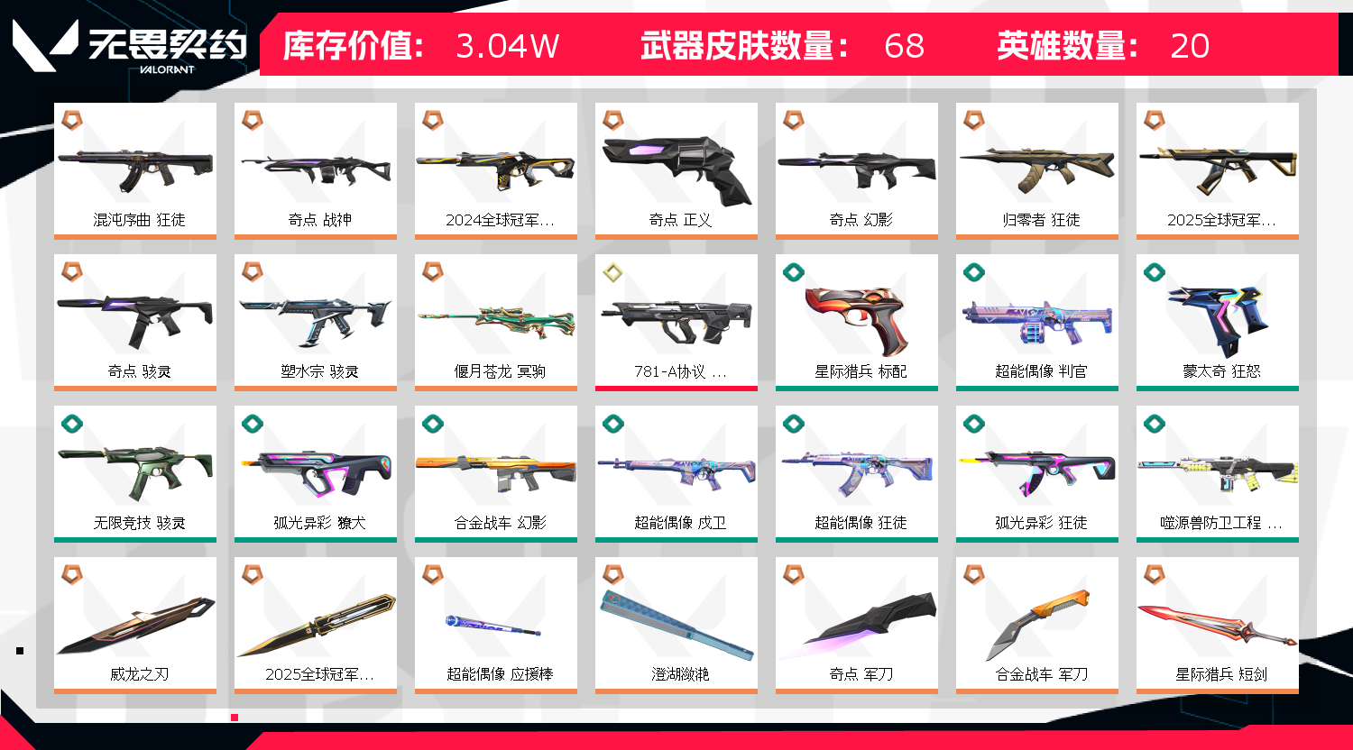 首页 > 租号大厅 > 无畏契约-wegame > wegame/wegame > 2025冠军套威龙之刃 澄湖扇子 2025狂徒 2024幻影 奇点正义 苍龙狙